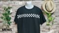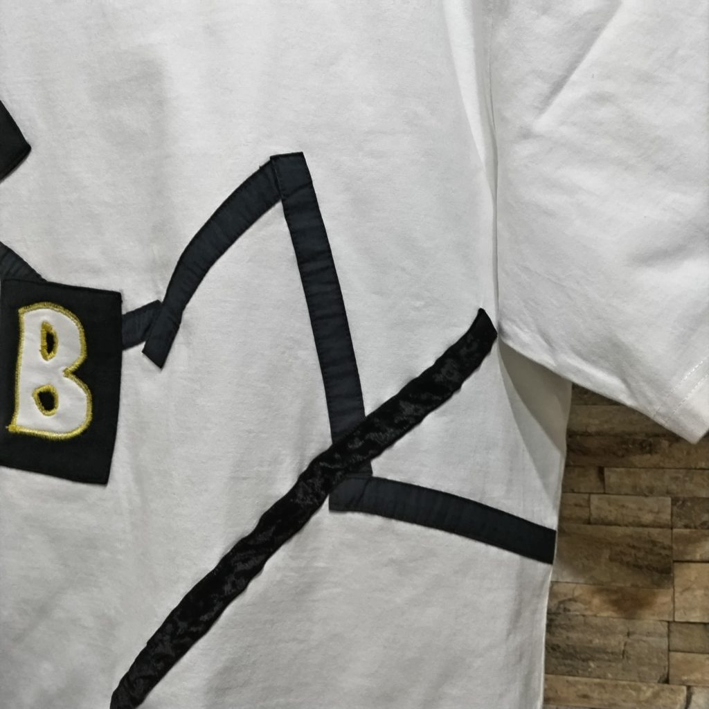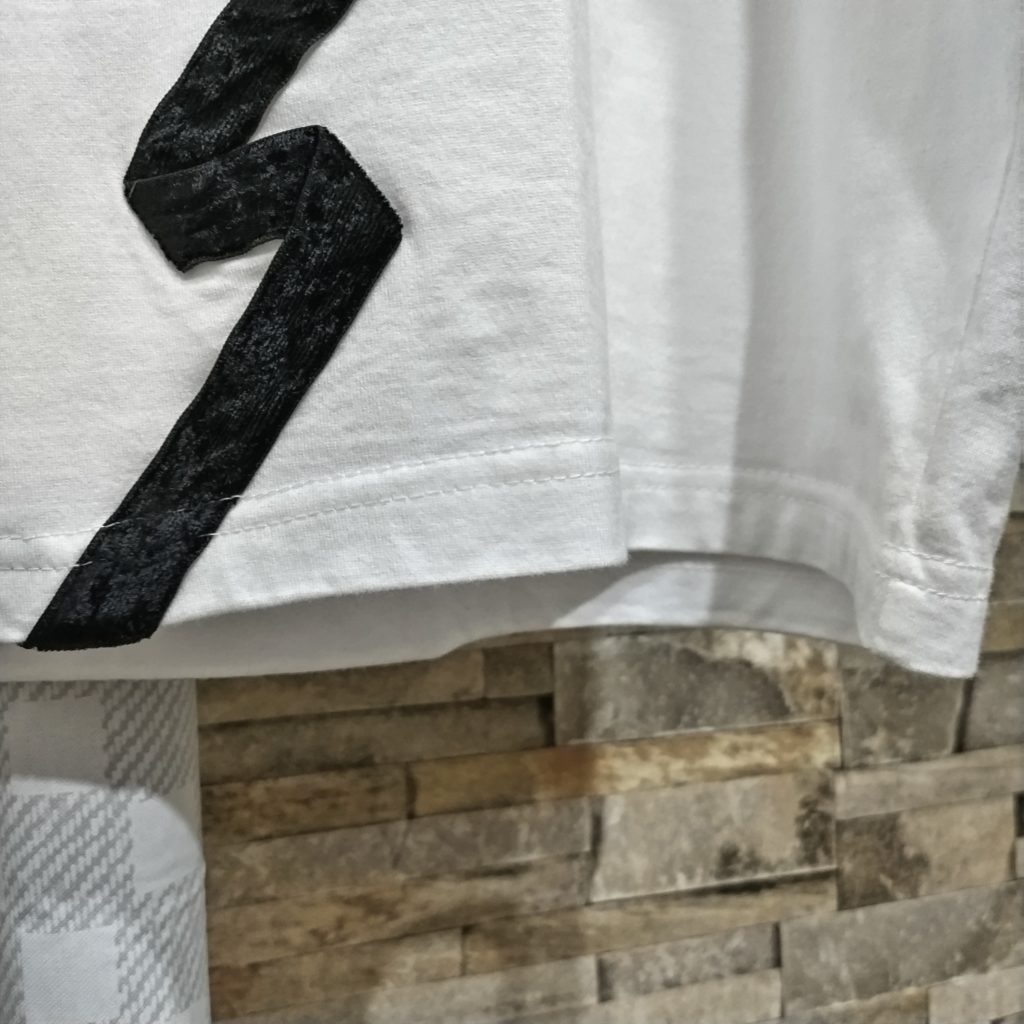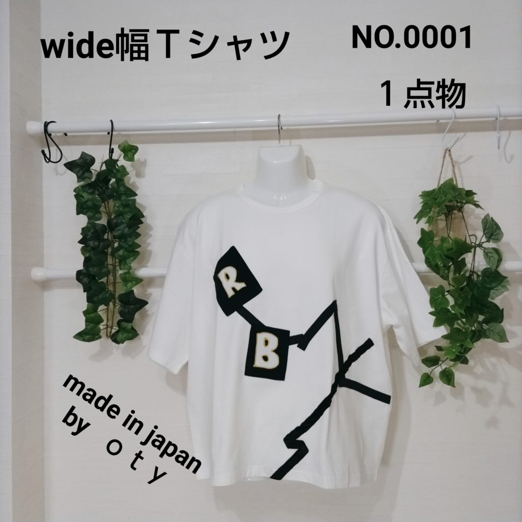 メンズLサイズの白(オフしろ)ベースの日本国内製造の1点物wide幅Tシャツです。身幅、肩幅がゆったり目のスタイルです。白の綿100%の少し厚みのある天竺生地に黒の生地ベースに白生地の英字にチドリミシンでハンドメイド風のふちどりのデザインはちょっとほっこりする感があります。そこにベロアテープと綿テープをトリッキーに組み合わせた商品です。R部分はポケットになっています。遊び心満載の一品です。衿ぐりは共地のバインダー仕様。袖口、裾は二本針仕様。