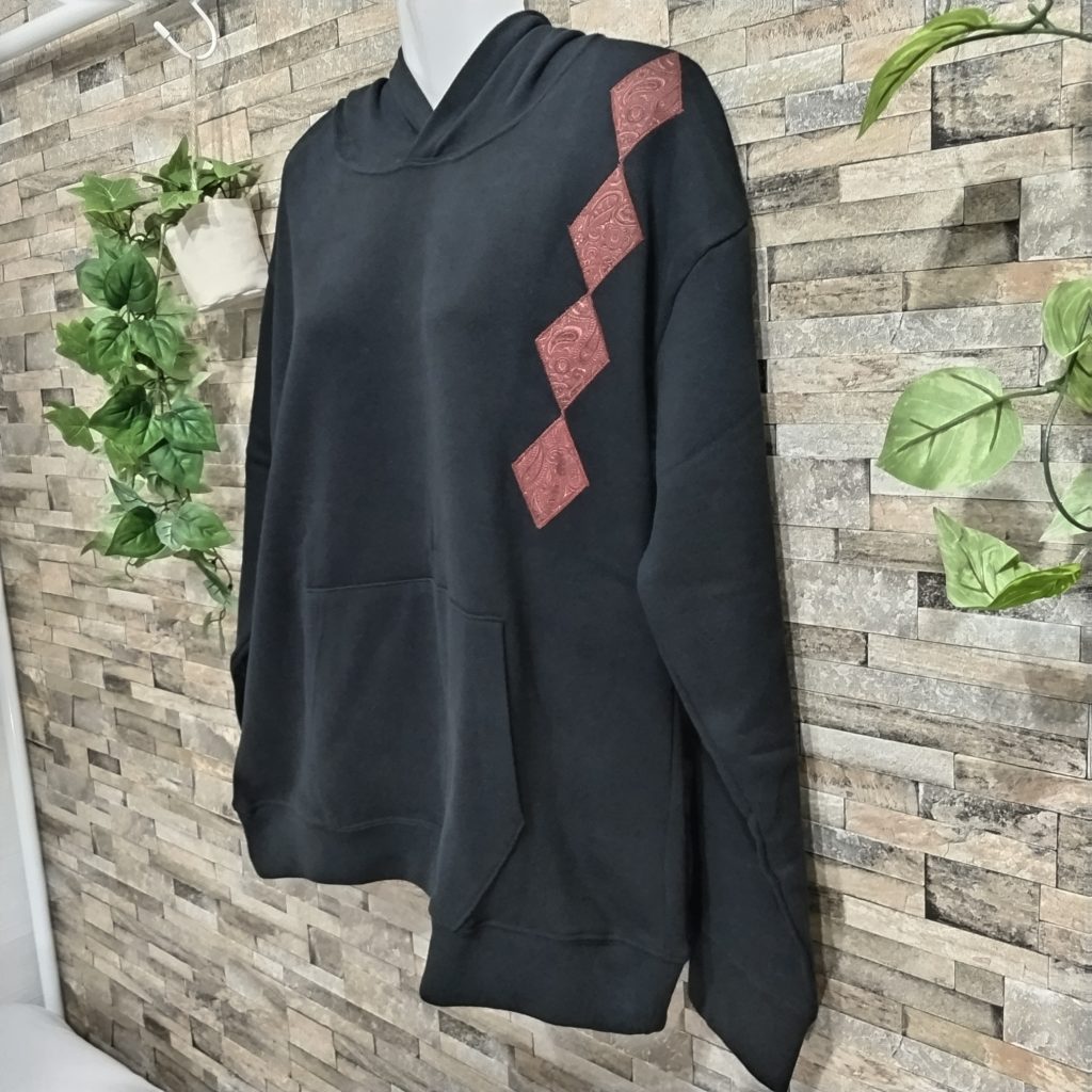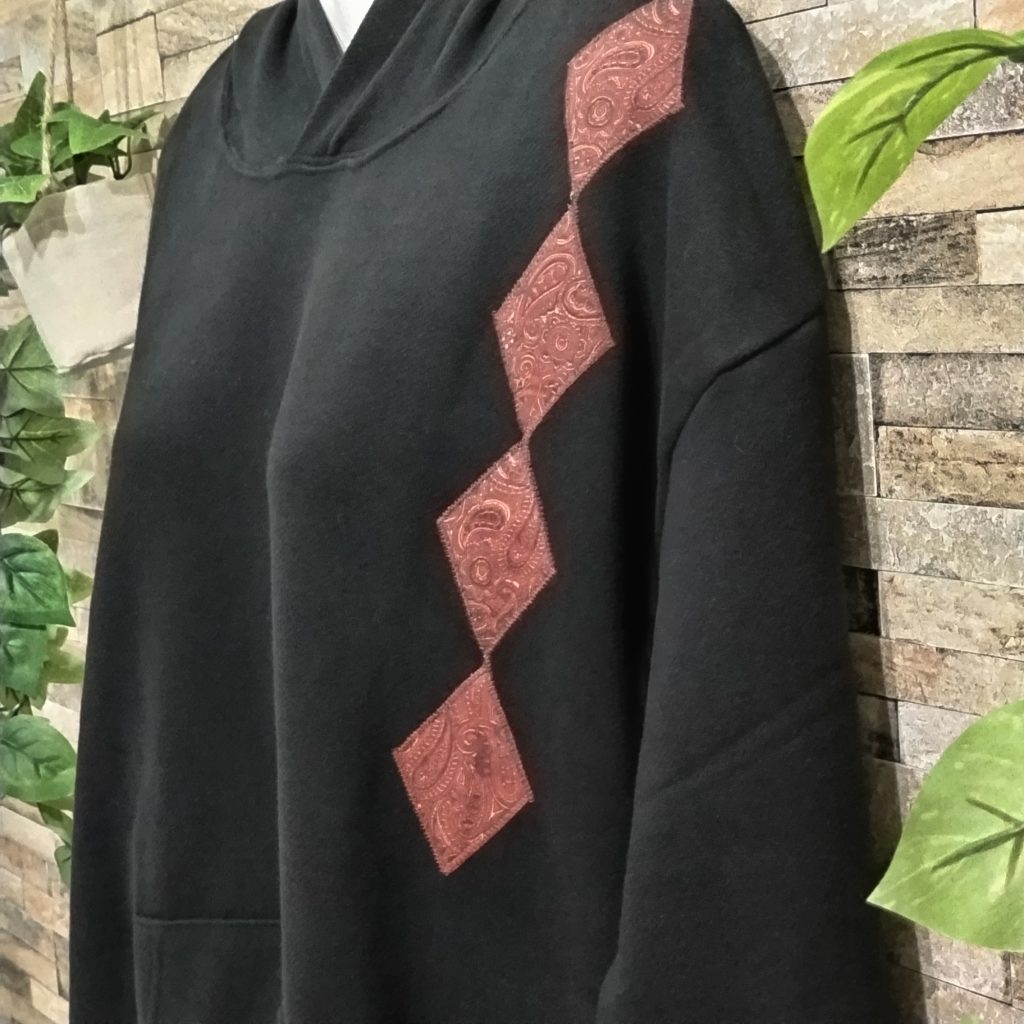 レディースMサイズの黒ベースの裏毛の日本国内製造の1点物パーカーです。生地は裏毛ですが、重くは感じない軽めの生地なので、春先、オールシーズン十分着こなせます。袖口、裾はまたぎの二本針仕様。BODYデザインはシンプルですが、アクセントに左前肩から昭和レトロ感のある懐かしい四連のダイヤ状の#ペイズリー柄 の生地をチドリステッチで叩き付け。後身にも二連のペイズリー柄生地。年齢に関係なく楽しんで着こなしてもらいたい一品です。ご自分用、お母様へのプレゼントにもぜひ!
