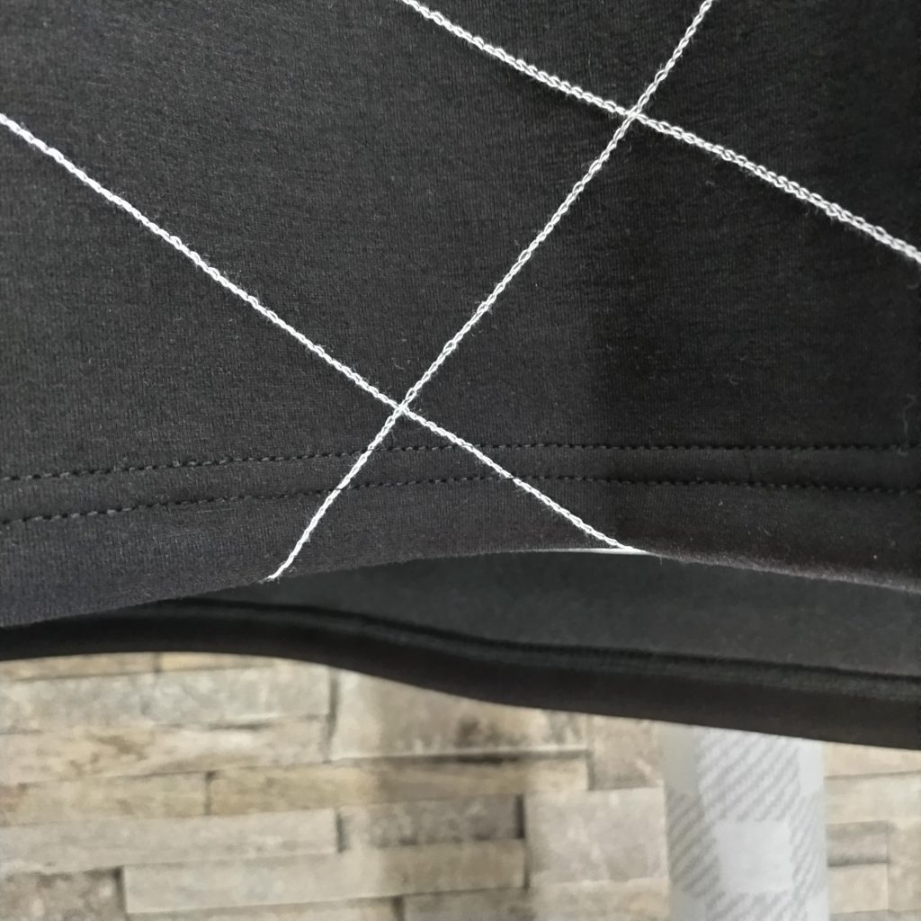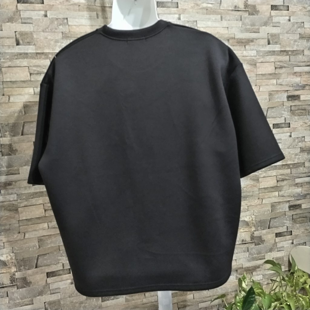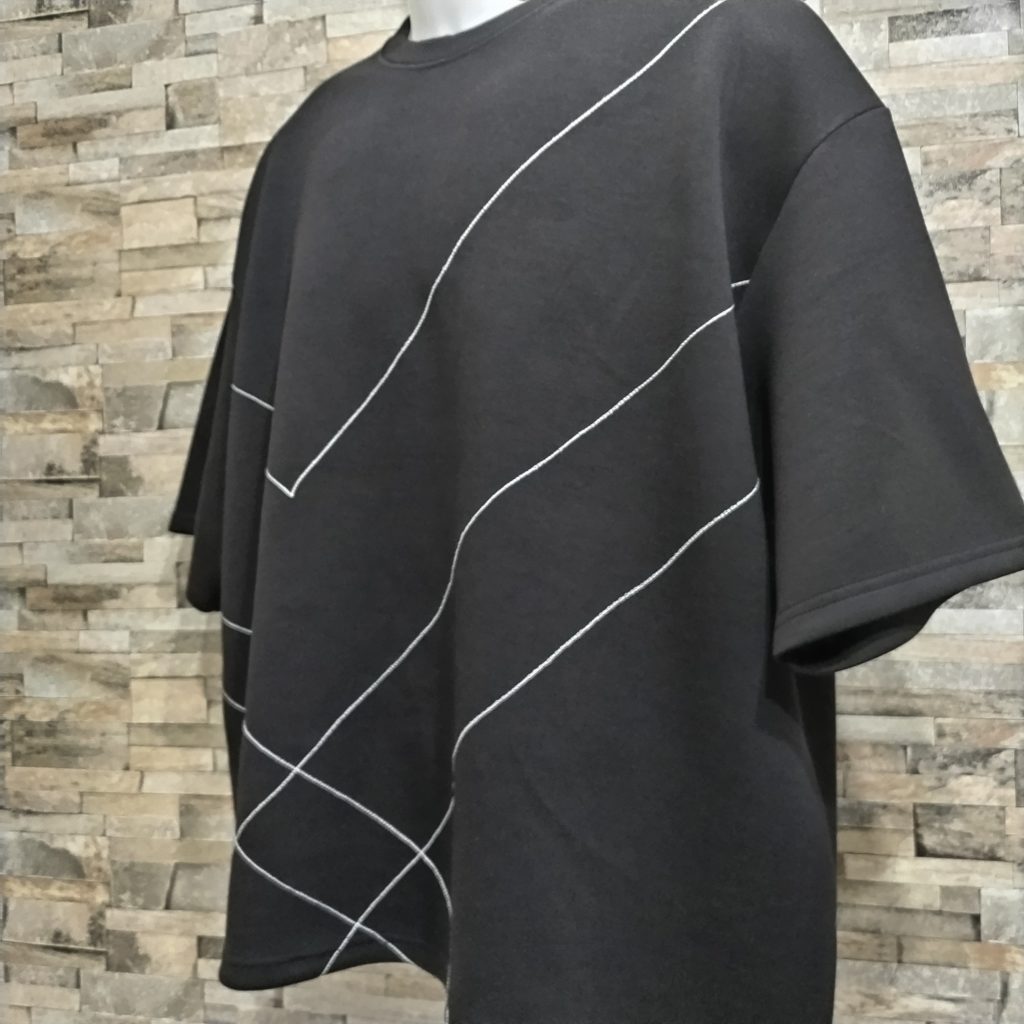 メンズLサイズの黒ベースの日本国内製造の1点物Tシャツです。素材は肉厚でポリエステル80%、レーヨン15%、ポリウレタン5%の光沢感、シャリ感の中に軽さもある素材のダンボールニットです。BODYにはホワイトの糸でチェーンステッチを施した斬新なデザインの1点物です。サイズはメンズM表記ですが、Wide幅なのでM~Lサイズでも大丈夫かと思います。下記のサイズ欄でご確認ください。もちろん、ユニセックスでお楽しみできます。ロンTとの重ね着もOK!ご理解の上、ご検討、ご購入をお願いします。衿ぐりは共地の付け衿またぎの二本張り始末。袖口、裾は二本針仕様。