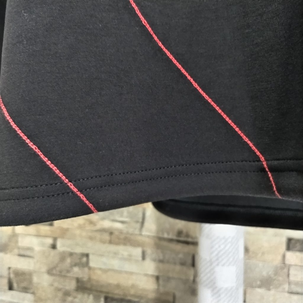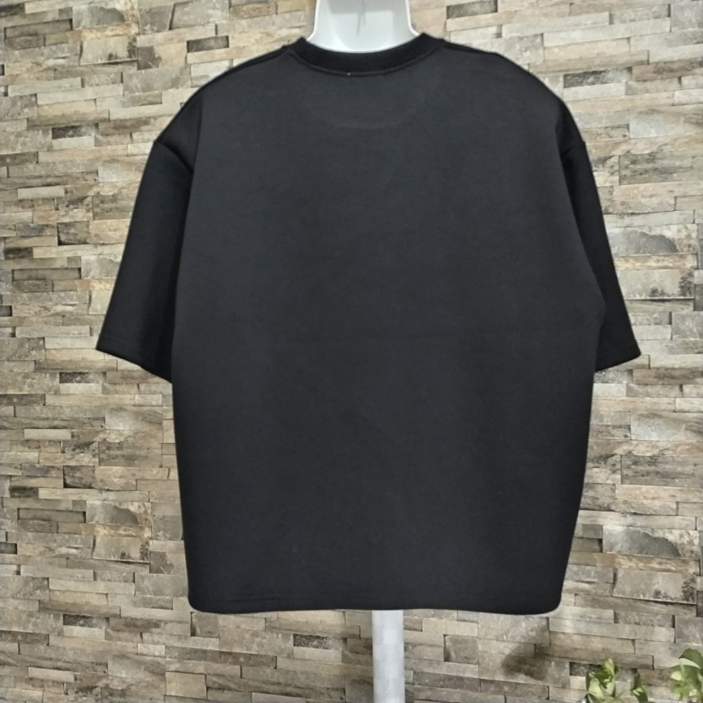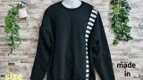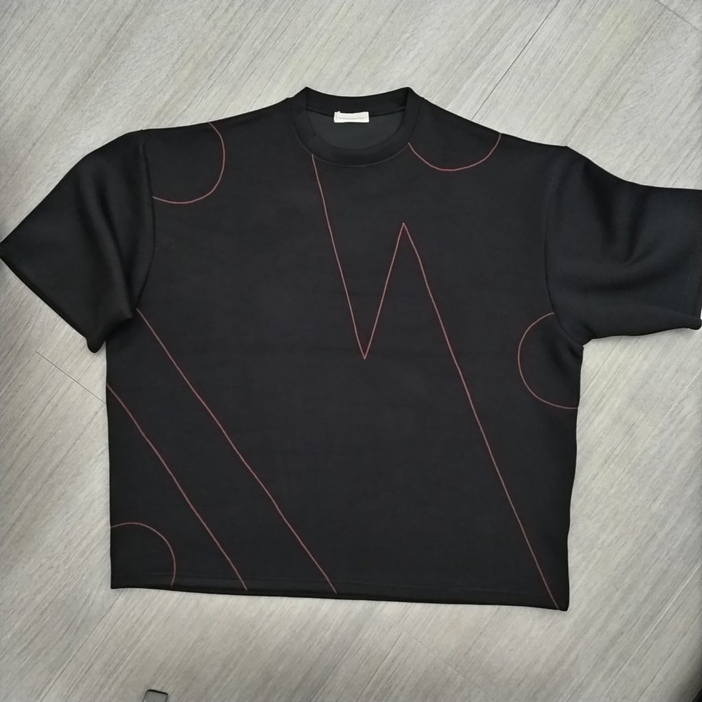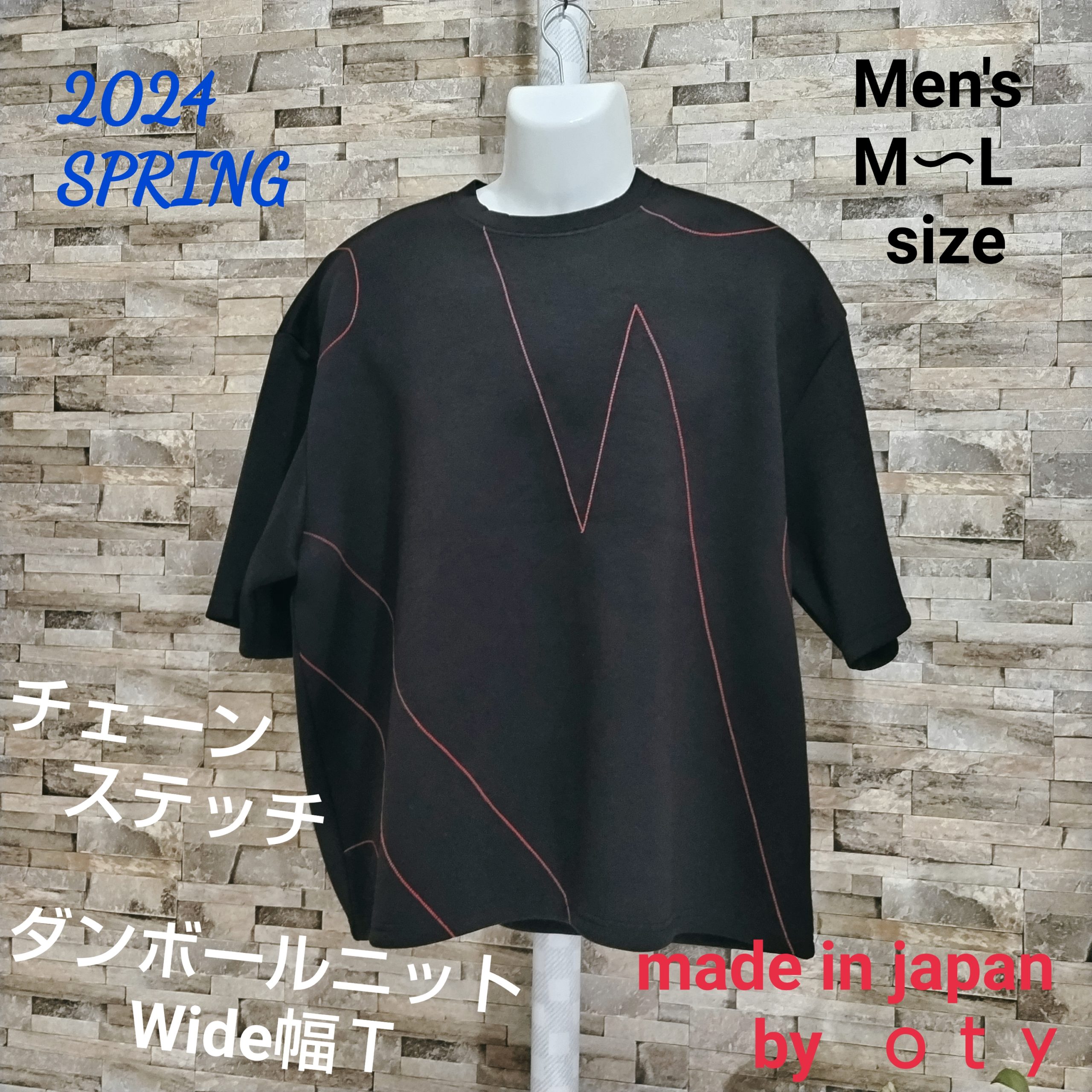 メンズLサイズの黒ベースの日本国内製造の1点物Tシャツです。素材は肉厚でポリエステル80%、レーヨン15%、ポリウレタン5%の光沢感、シャリ感の中に軽さもある素材のダンボールニットです。BODYに赤の糸でチェーンステッチをランダムに施した斬新なデザインの1点物です。サイズはメンズM表記ですが、Wide幅なのでM~Lサイズでも大丈夫かと思います。下記のサイズ欄でご確認ください。もちろん、ユニセックスでお楽しみできます。ロンTとの重ね着もOK!