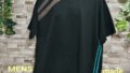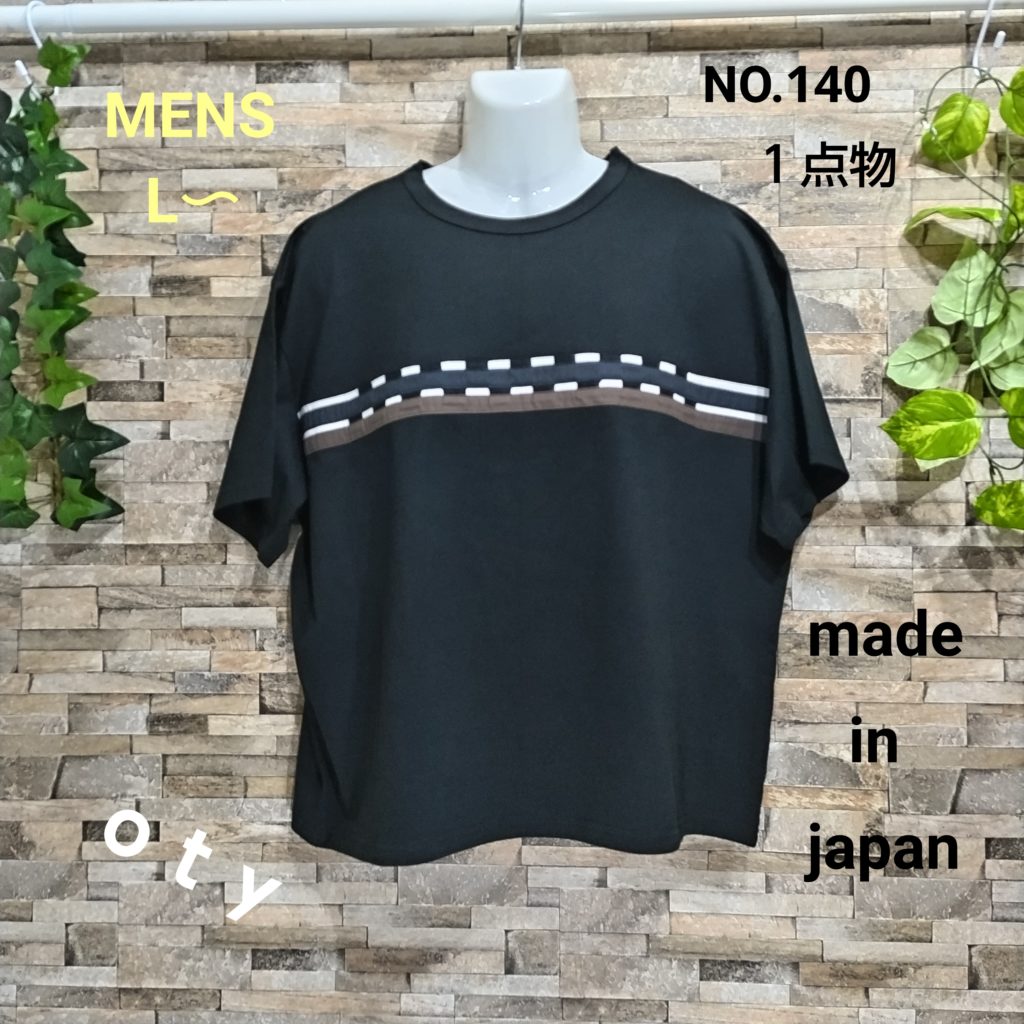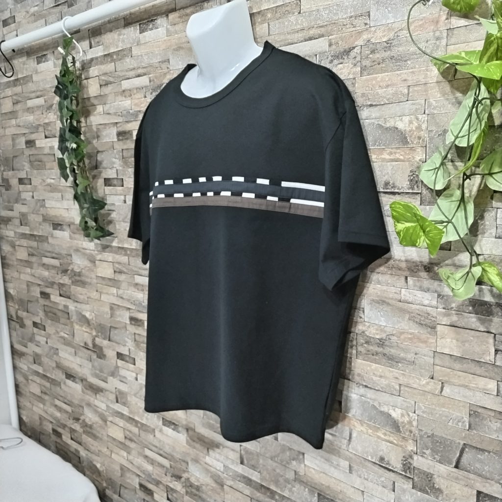 メンズLサイズの黒ベースの日本国内製造の1点物Wide幅Tシャツです。身幅、肩幅がゆったり目のスタイルです。黒の綿100%の少し厚みのある天竺生地です。胸元には白&黒&ブラウンの生地で独特なチェッカーフラッグ柄に作って配置したあるインパクトのある遊び心のある1点物Tシャツです。衿ぐりは共地のバインダー仕様。袖口、裾は二本針仕様。