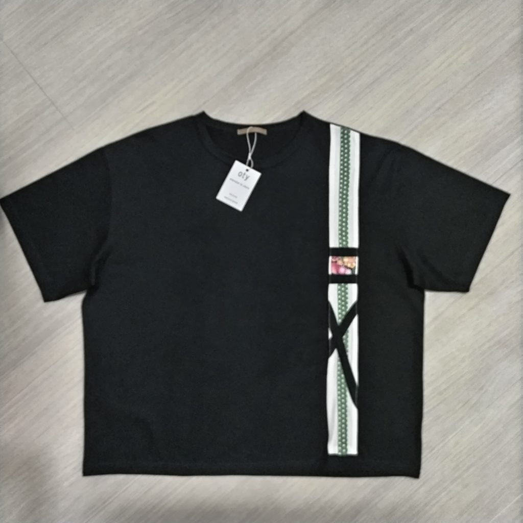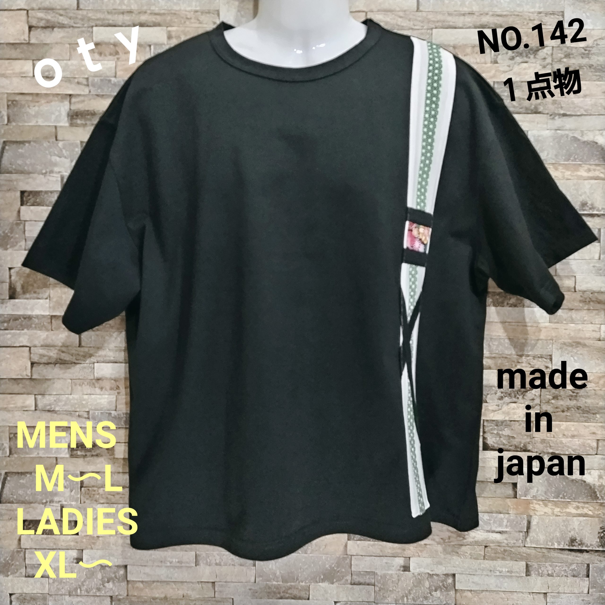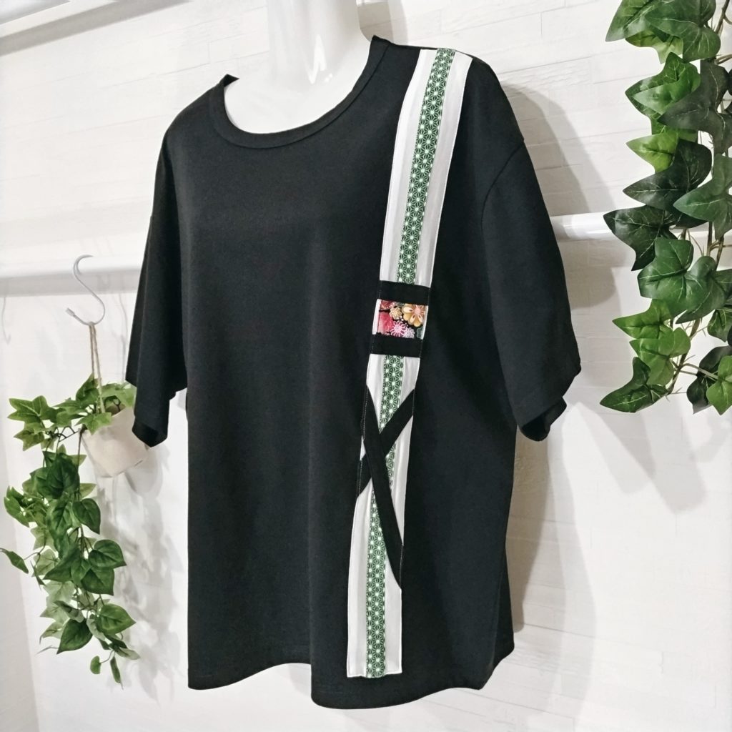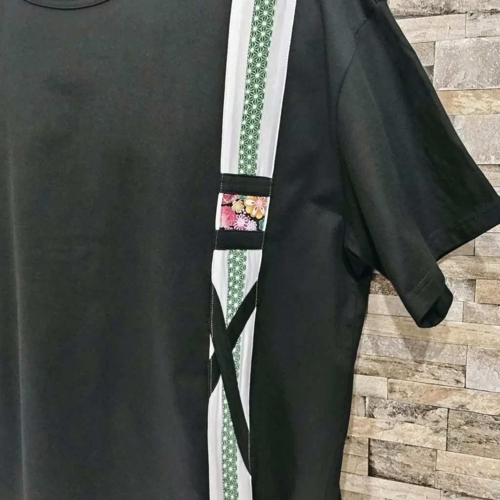 メンズLサイズの黒ベースの日本国内製造の1点物Wide幅Tシャツです。身幅、肩幅がゆったり目のスタイルです。黒の綿100%の少し厚みのある天竺生地です。左前脇に白&グリーンの和柄生地でベースのラインを作り、その上に花柄和柄プリント生地と黒テープを絡めて、独特のラインを飾った遊び心のある1点物Tシャツです。衿ぐりは共地のバインダー仕様。袖口、裾は二本針仕様。