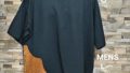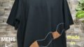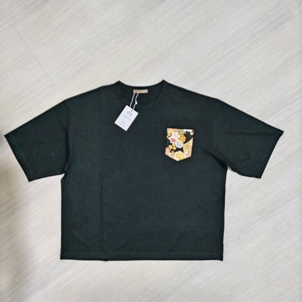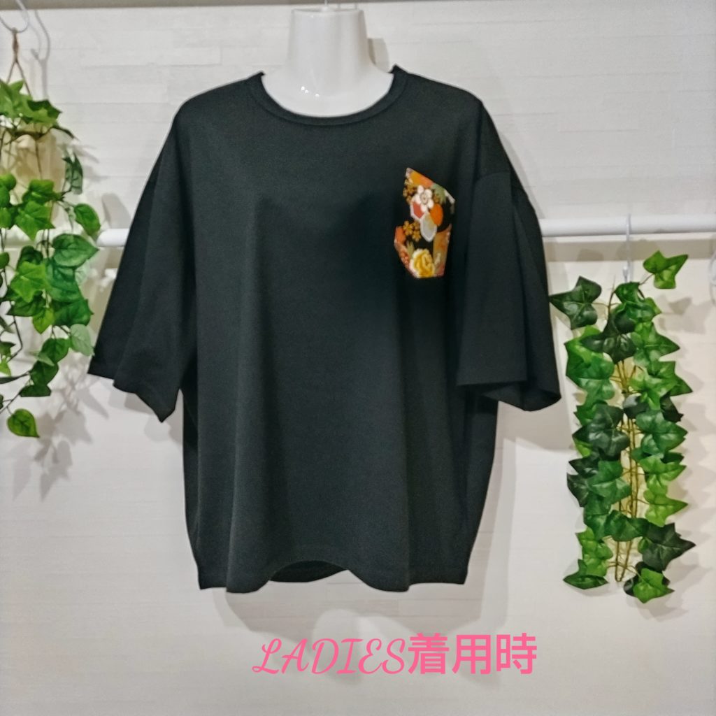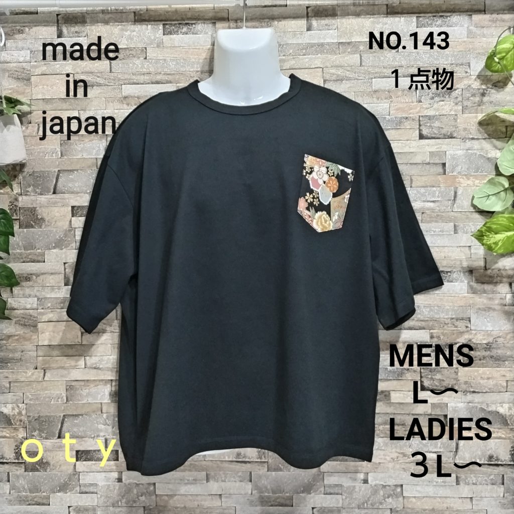 メンズLサイズの黒ベースの日本国内製造の1点物Wide幅Tシャツです。身幅、肩幅がゆったり目のスタイルです。黒の綿100%の少し厚みのある天竺生地です左胸に和柄プリント生地のポケットをつけ、後ろ身には黒のベロアテープを配置したある遊び心のある1点物Tシャツです。衿ぐりは共地のバインダー仕様。袖口、裾は二本針仕様。