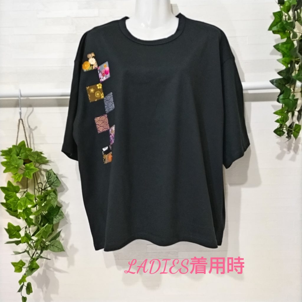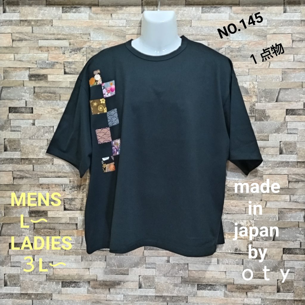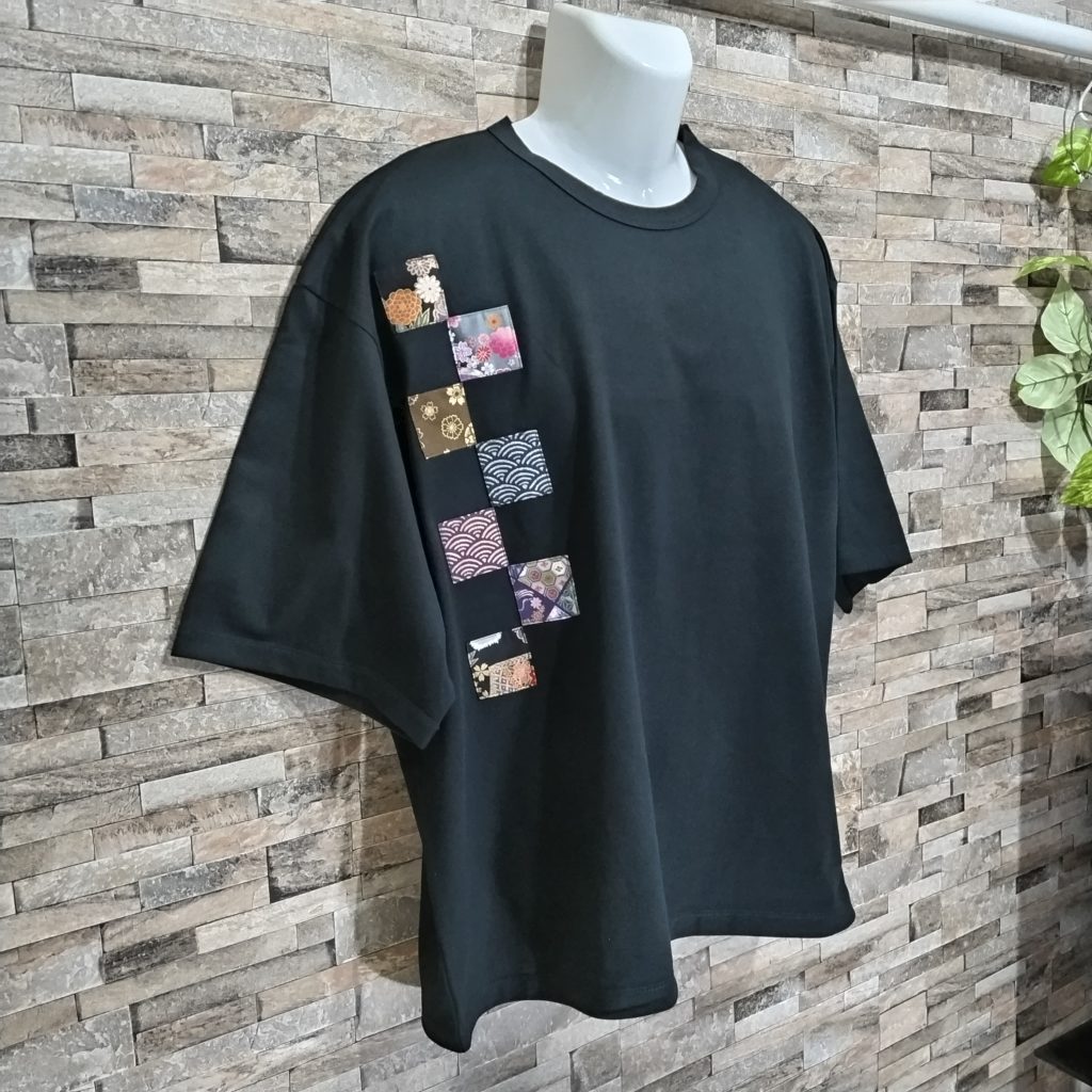 メンズLサイズの黒ベースの日本国内製造の1点物Wide幅Tシャツです。身幅、肩幅がゆったり目のスタイルです。黒の綿100%の少し厚みのある天竺生地です。右胸に四角形に形どった違う柄の和柄プリントを7つ大胆にに配置したある遊び心のある1点物Tシャツです。衿ぐりは共地のバインダー仕様。袖口、裾は二本針仕様。