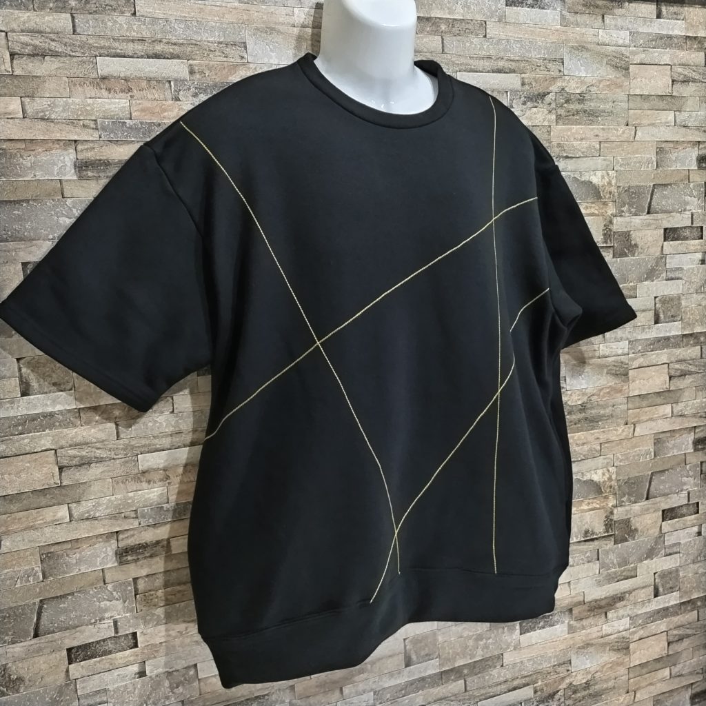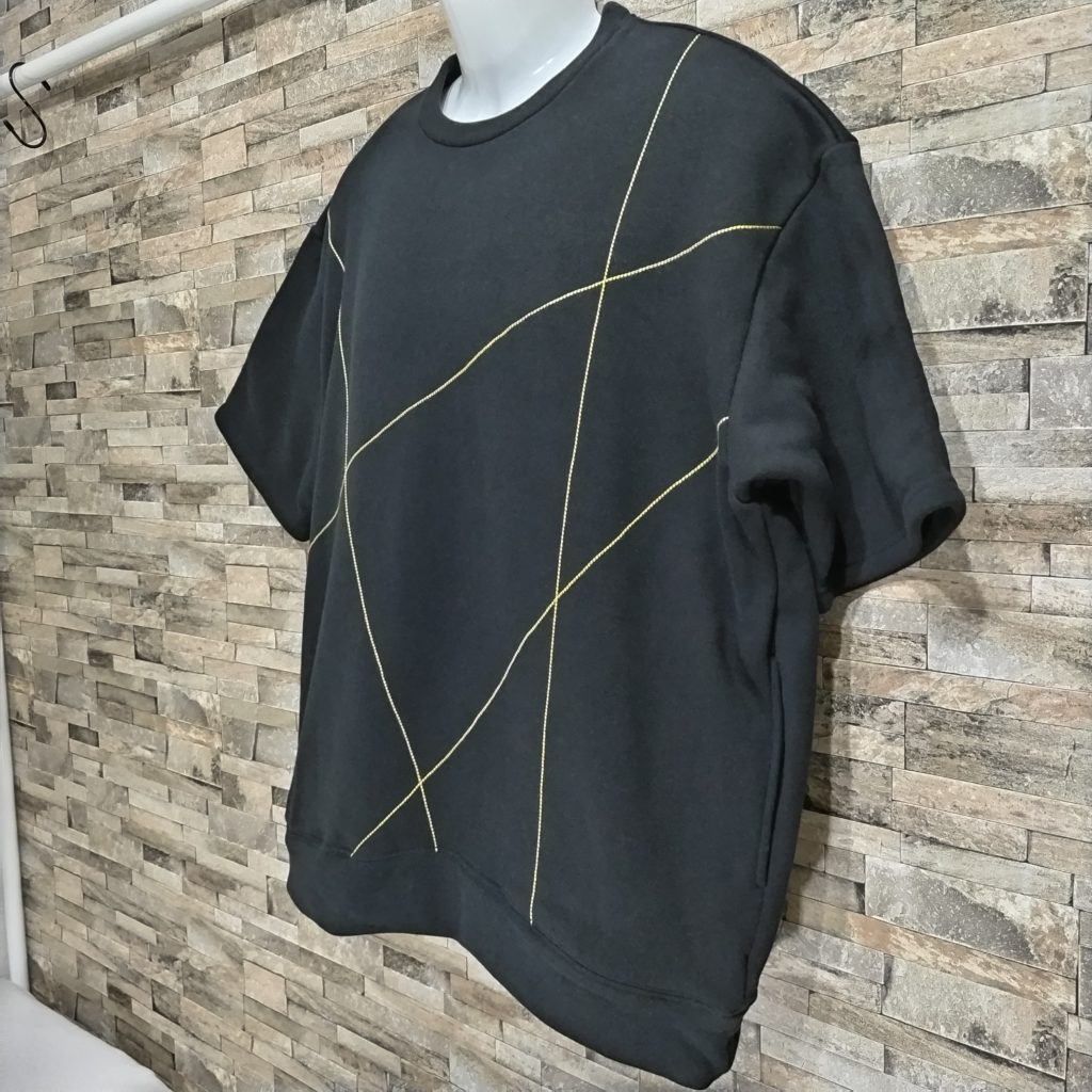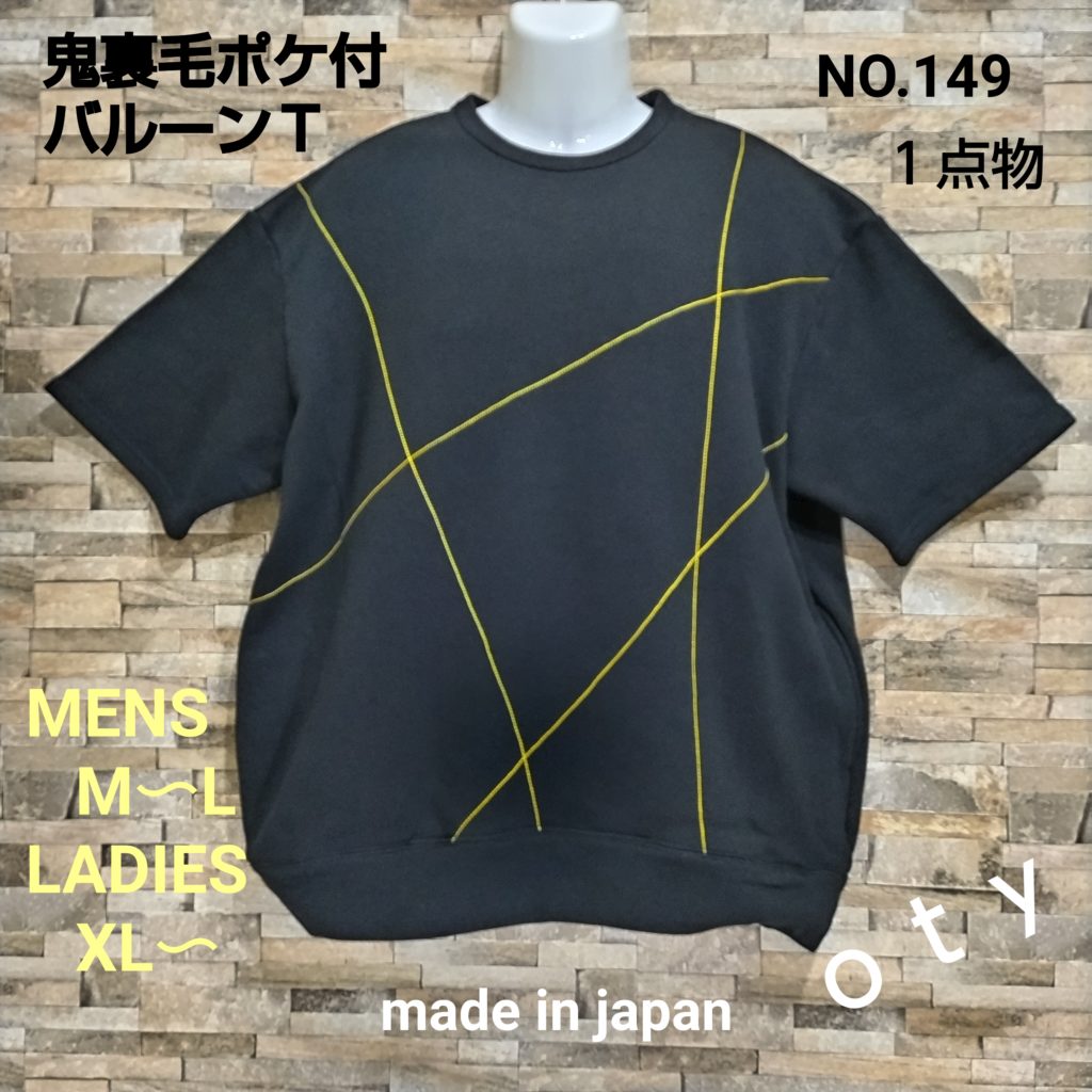 メンズM~Lサイズの黒の鬼裏毛の日本国製造の1点物の裏毛Tシャツです。形はバルーンタイプで両脇にはポケット付き。バルーンタイプなので女性が着てもゆったりかわいく着られます。ヘビーゲージの目の詰まったしっかりした裏毛です。袖口は二本針仕様。衿、裾は共地仕様。