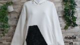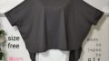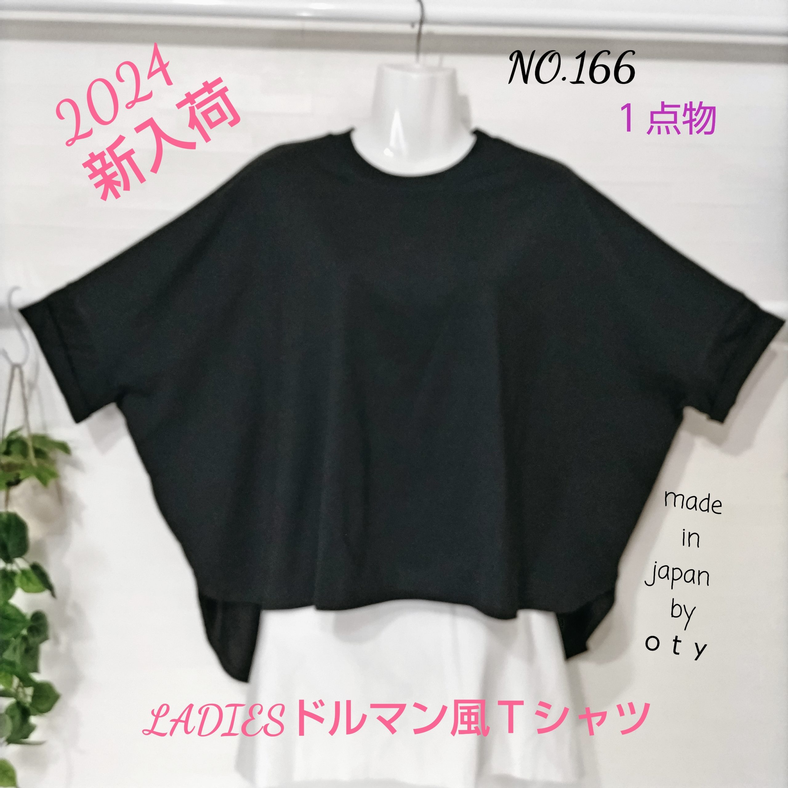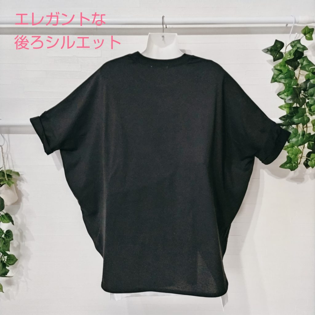 綿100%の天竺生地の変形ドルマンTシャツ。日本製。カラーは黒でサイズはFREEです。衿ぐりは同色のフライス生地を使用。肌触りがよく、これからの季節にはぴったりの商品です。前身、後ろ身は段差があり、袖口は折り返し始末になっています。全体的にエレガントに見えるシルエットを