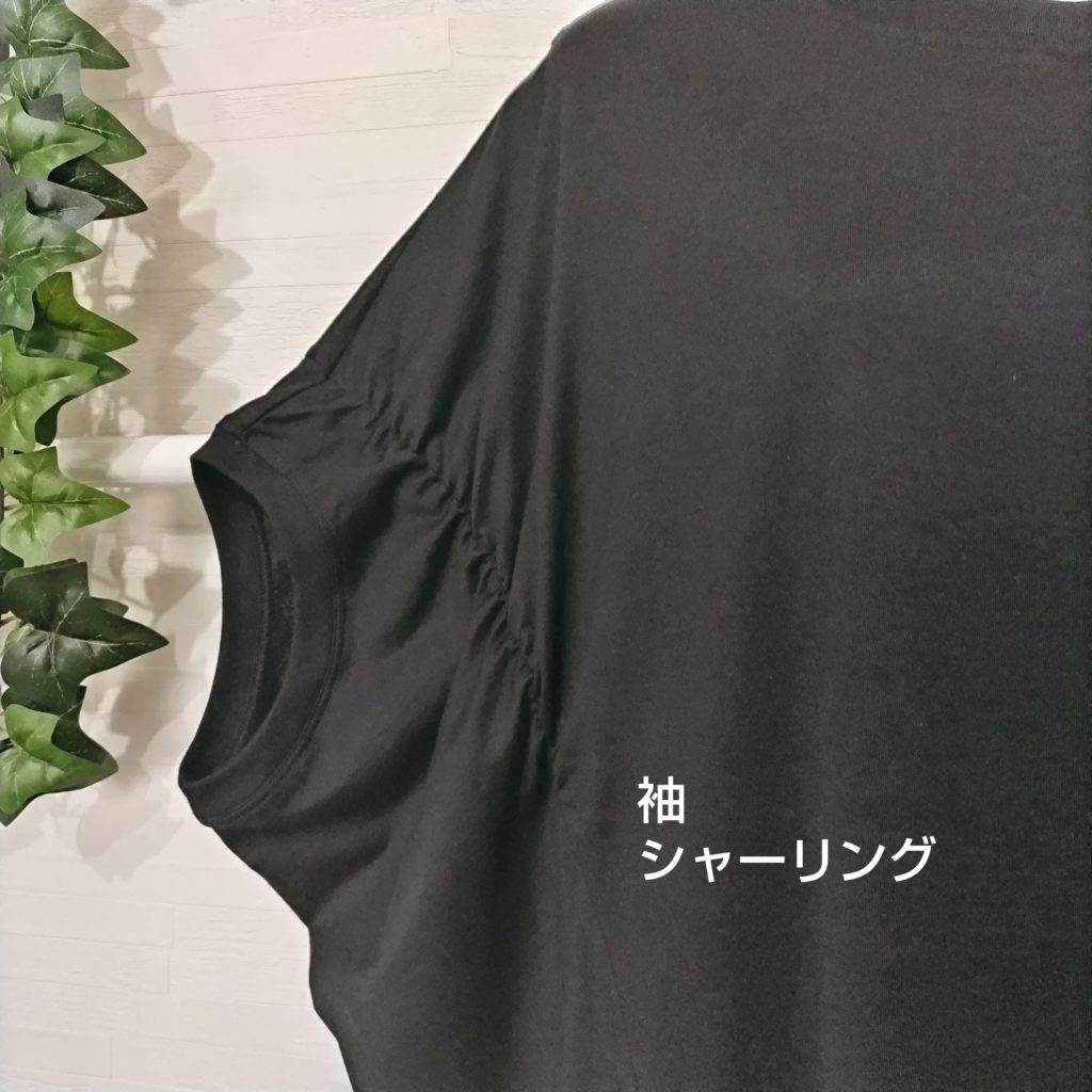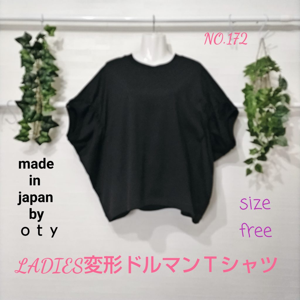 綿100%の天竺生地の変形ドルマンTシャツ。日本製。カラーは黒でサイズはFREEです。衿ぐりは同色のフライス生地を使用。肌触りがよく、これからの季節にはぴったりの商品です。袖口は同色フライス生地仕様になっています。最大の特徴は前身上部のみに二本のシャーリングを入れ、インパクト且つ全体的にエレガントに見えるシルエットを
