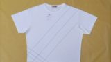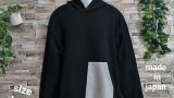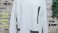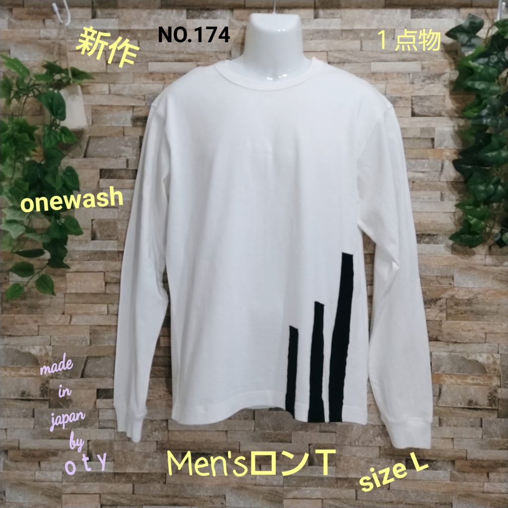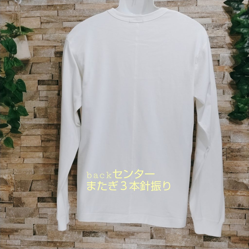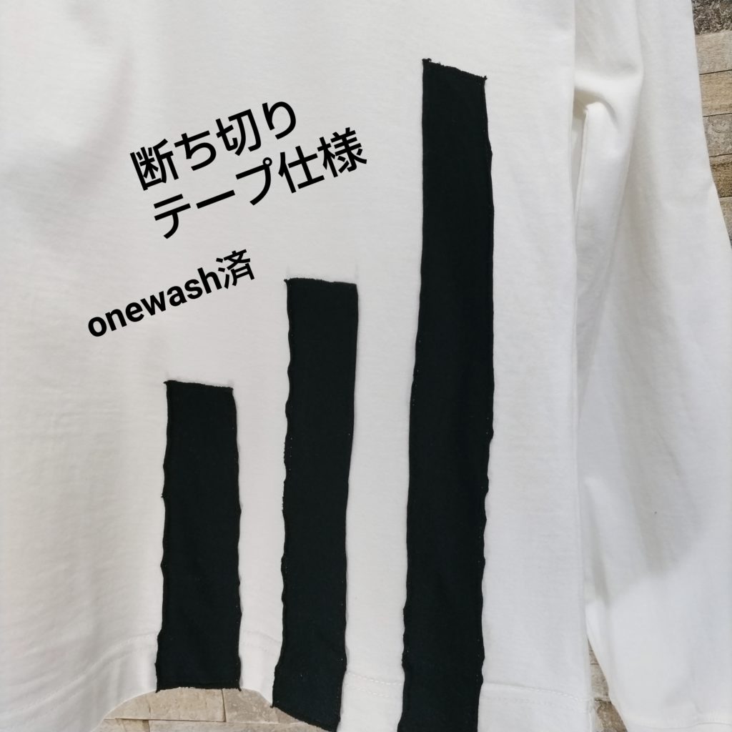 綿100%の天竺生地の断ち切りデザインユニーク・ロンTシャツ。日本製。カラーはオフ白でサイズはLです。衿ぐりは同色のフライス生地を使用。肌触りが良い生地です。後ろ身中央にはハギが入っており、三本針振り仕様です。AH、袖口は片倒しの二本針仕様。衿はバインダー仕様です。前左裾の黒の生地のテープは断ち切り仕様になっています。断ち切り製品なのでお洗濯後は多少断ち切り部分にほつれが出ますが、引っ張らずにハサミでカットして、断ち切りの風合いをお楽しみください。製品工程上、ONEWASHしています。ご理解の程、お買い求めください。
