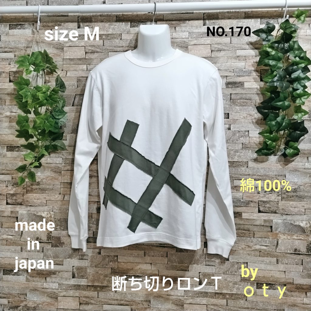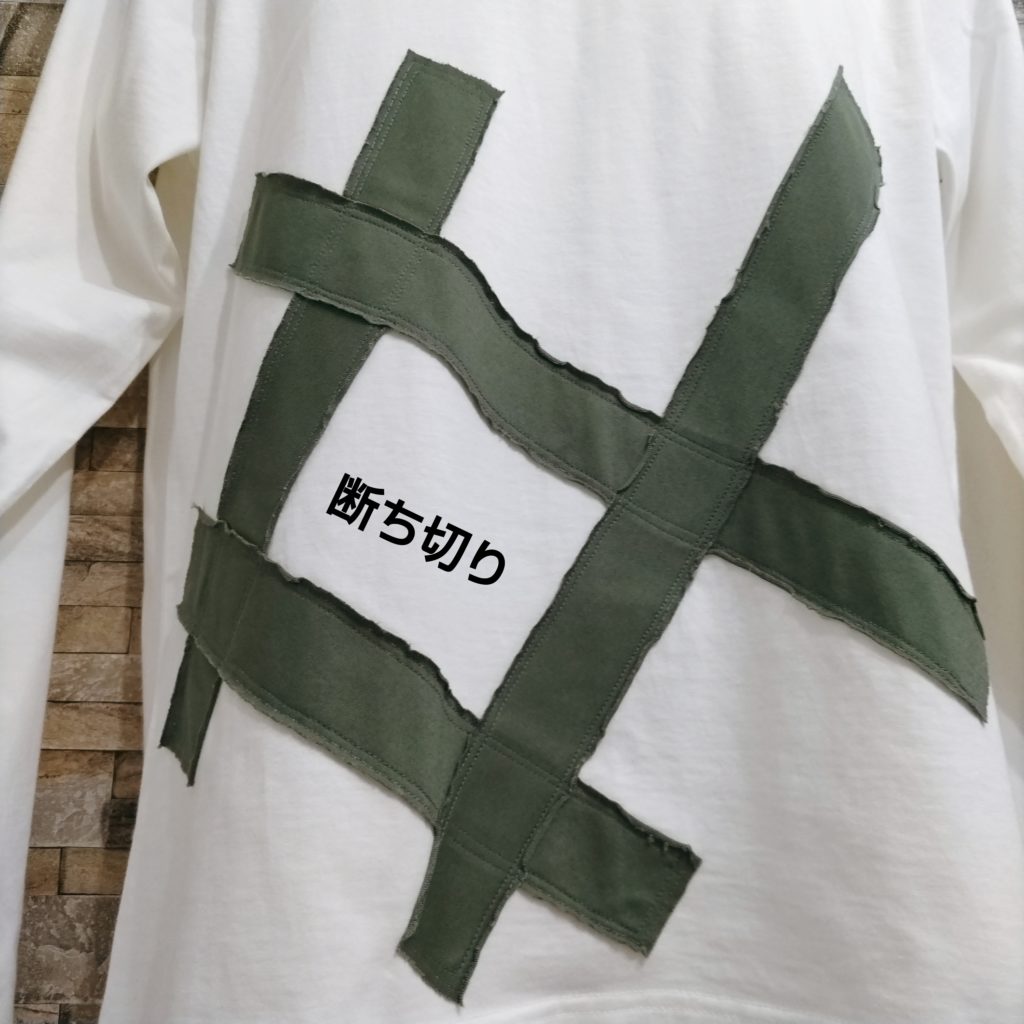 綿100%のしっかり目の天竺生地の断ち切りデザインユニーク・Tシャツ。日本製。カラーはオフでサイズはM~Lです。衿ぐりは生成(オフ白)色のフライスバインダー使用。肌触りがよく、これからの季節にはぴったりの商品です。前身には大胆なカーキ色のテープを断ち切り叩きつけています。断ち切り製品なのでお洗濯後は多少断ち切り部分にほつれが出ますが、引っ張らずにハサミでカットして、断ち切りの風合いをお楽しみください。製品工程上、ONEWASHしています。ご理解の程、お買い求めください。