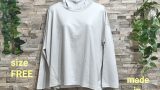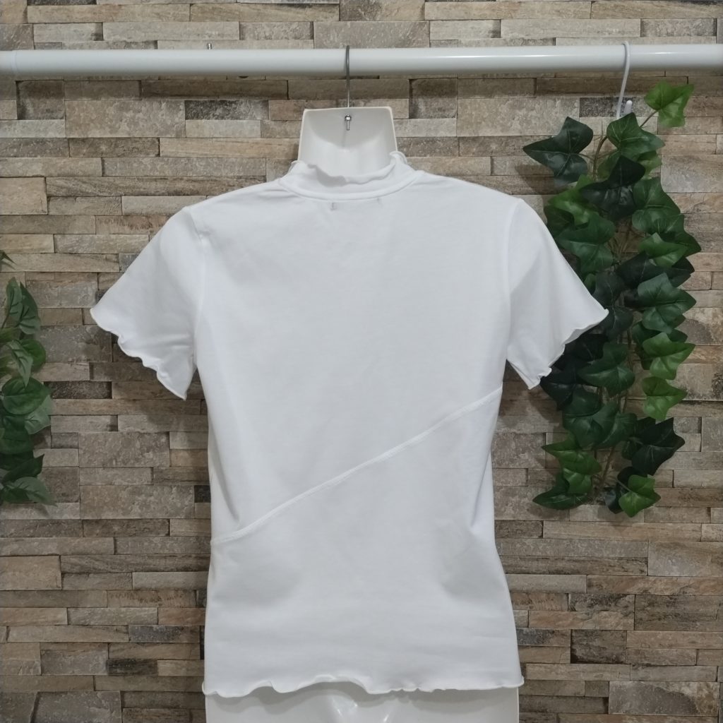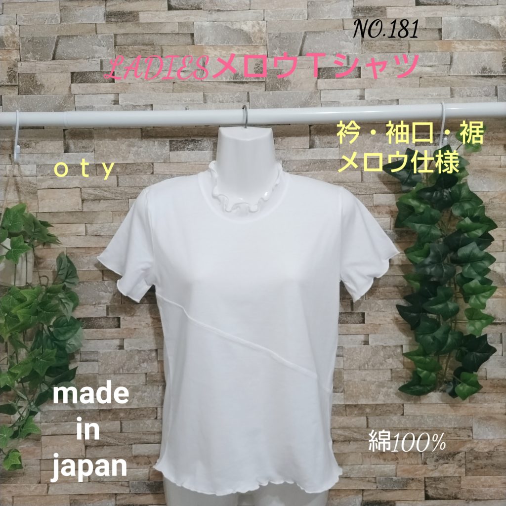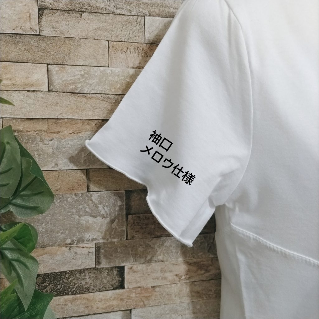 綿100%のレディースSサイズ。色はオフです。衿ぐり・袖口・裾はメロウ仕様になっています。綿100%の天竺素材なので、肌触りはなめらかです。前身・後ろ身には大胆に斜めのハギが入っていて、そこにチドリステッチを入れたひと手間かかったTシャツです。