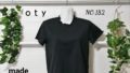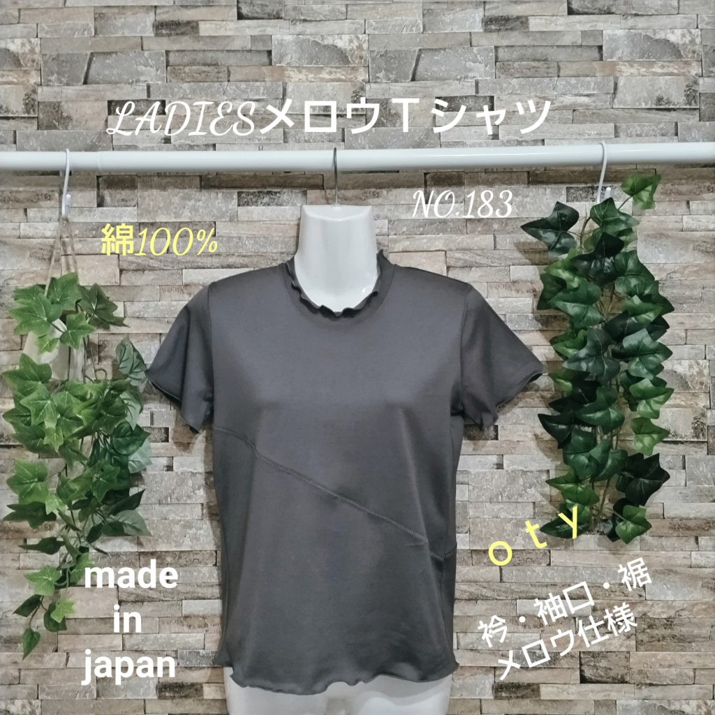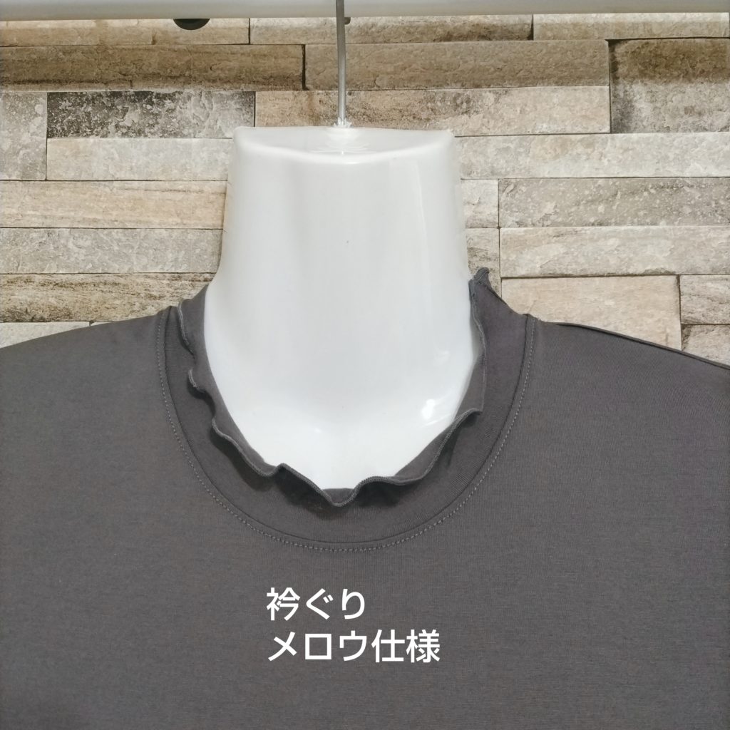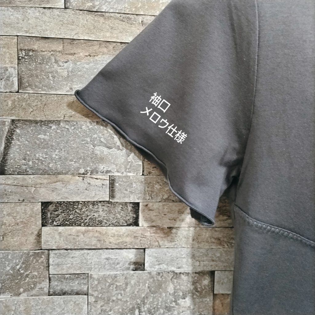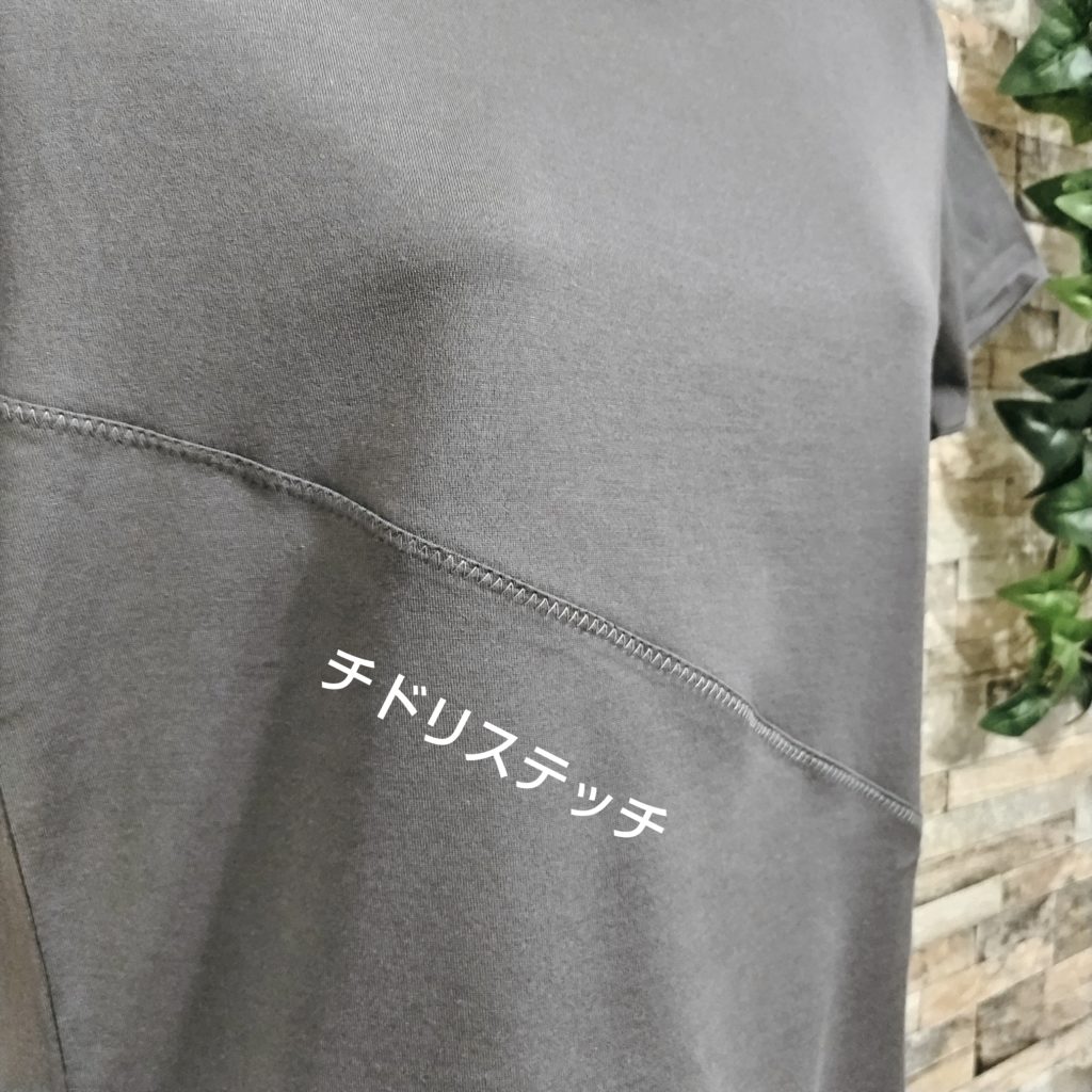 綿100%のレディースSサイズ。色はグレージュです。衿ぐり・袖口・裾はメロウ仕様になっています。綿100%の天竺素材なので、肌触りはなめらかです。前身・後ろ身には大胆に斜めのハギが入っていて、そこにチドリステッチを入れたひと手間かかったTシャツです。