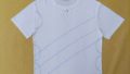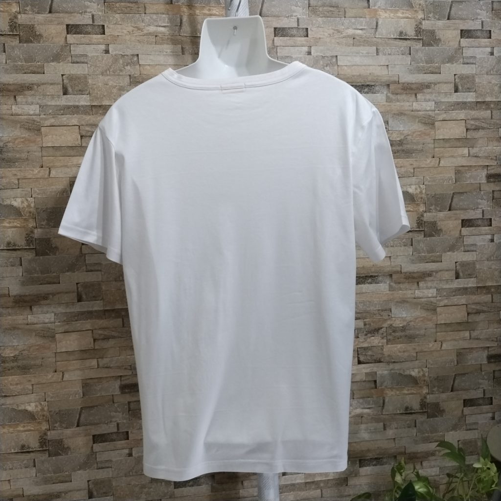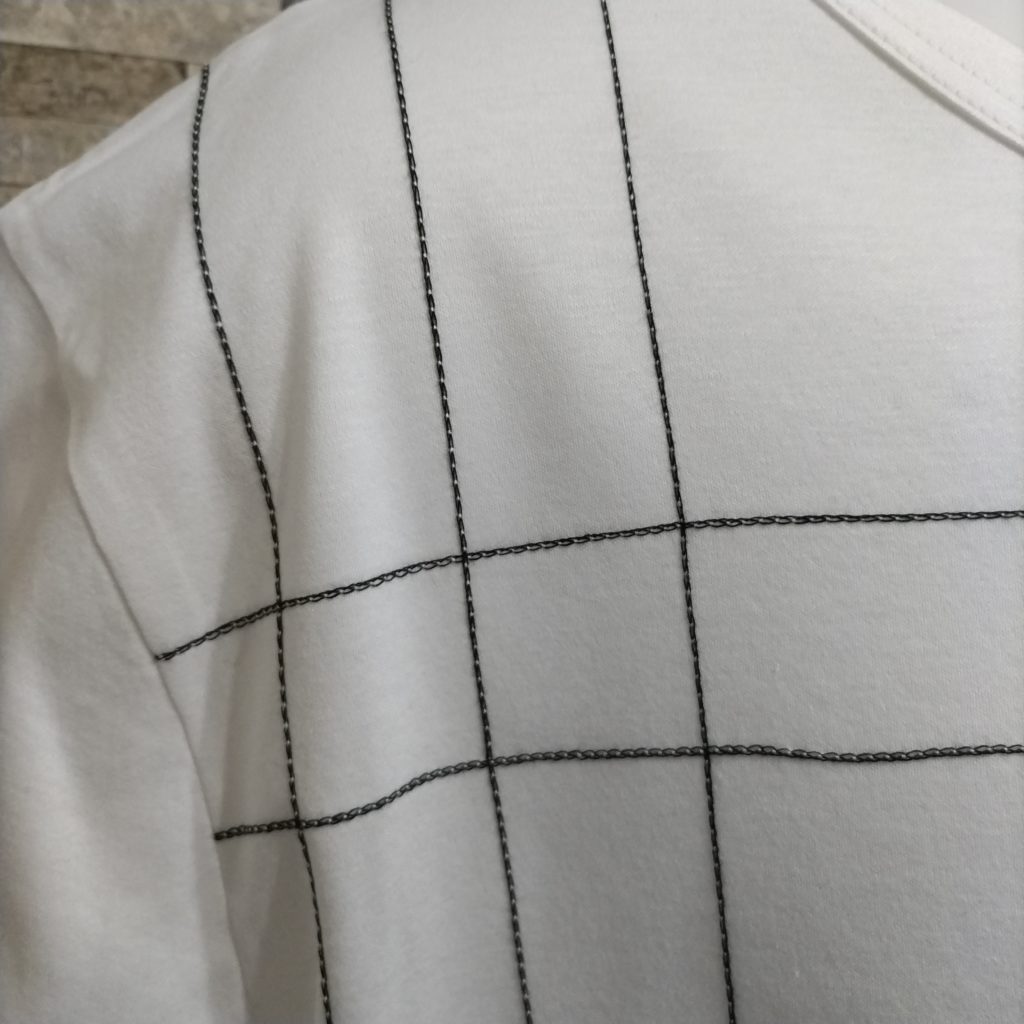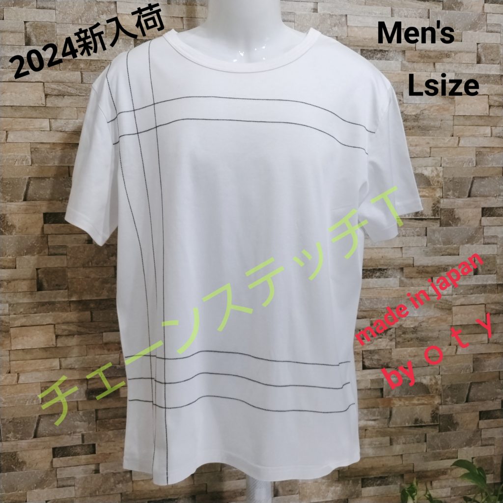 メンズLサイズの白ベースの日本国内製造の1点物Tシャツです。白の綿50%、ポリエステル50%の清涼感のある天竺生地です。前身前面に上糸ブラック、下糸ホワイトの糸でチェーンステッチを大胆に施した1点物Tシャツです。衿ぐりは共地のバインダー仕様。袖口、裾は二本針仕様。製造工程上、ONEWASHしています。製品洗いが苦手な方はご遠慮ください。