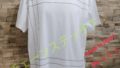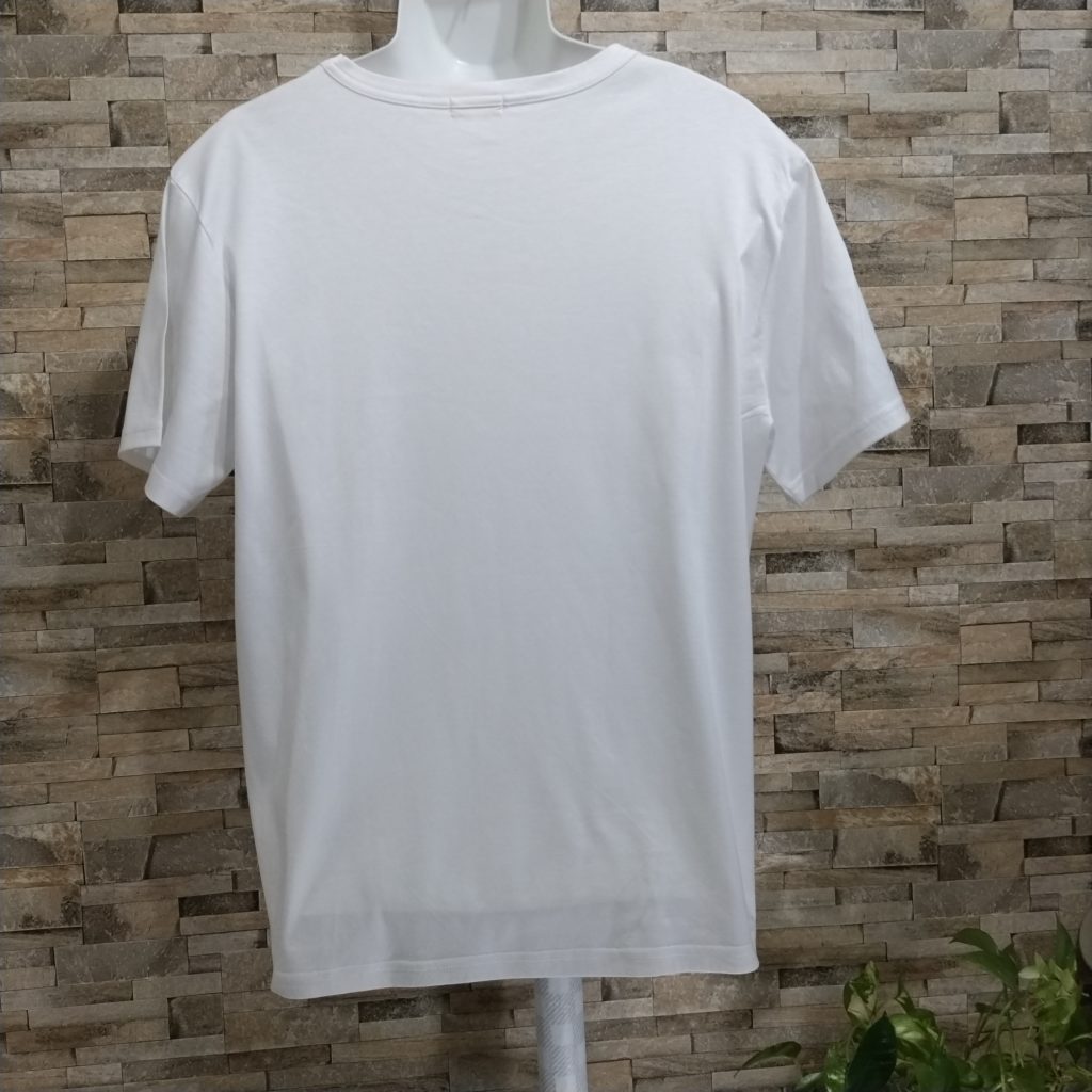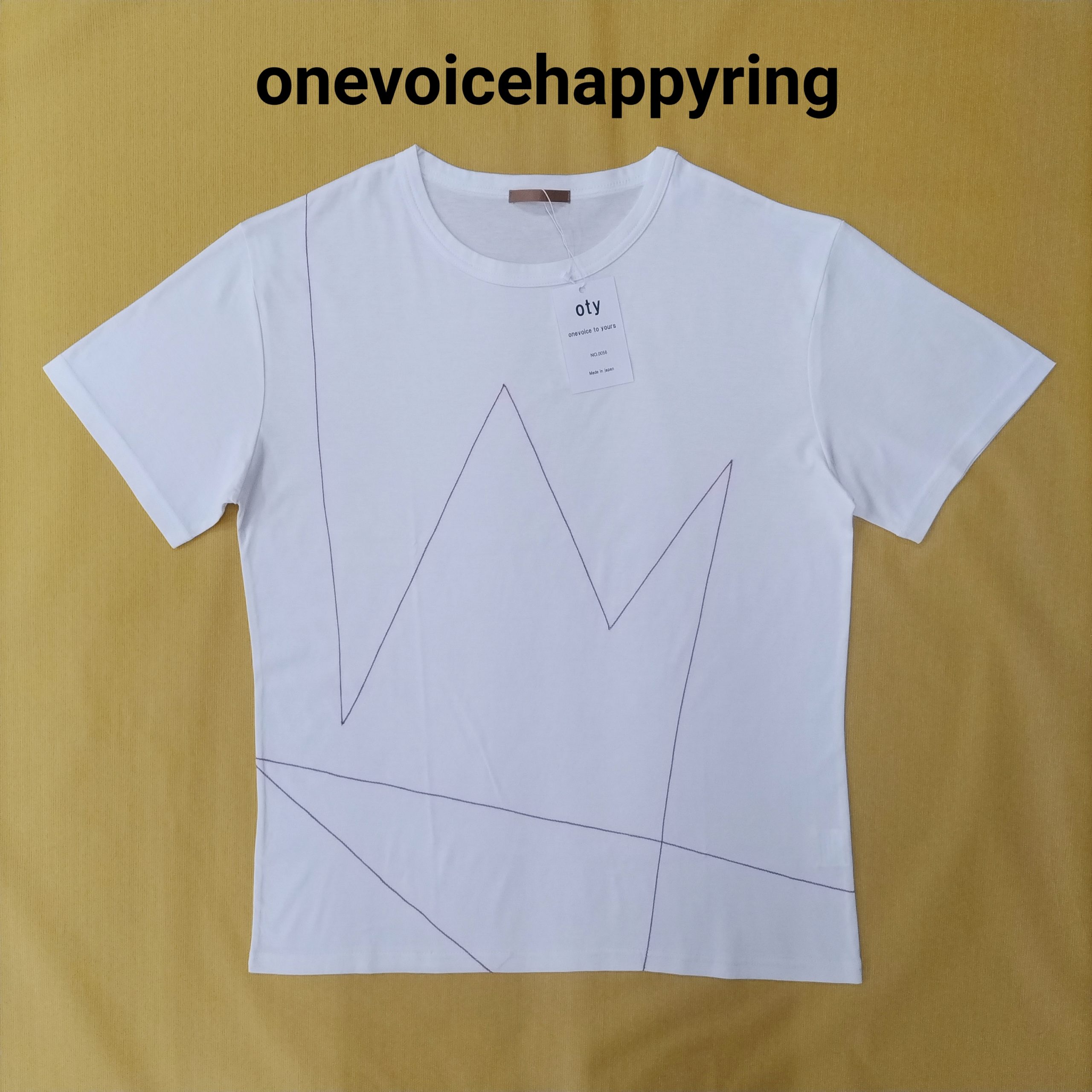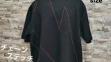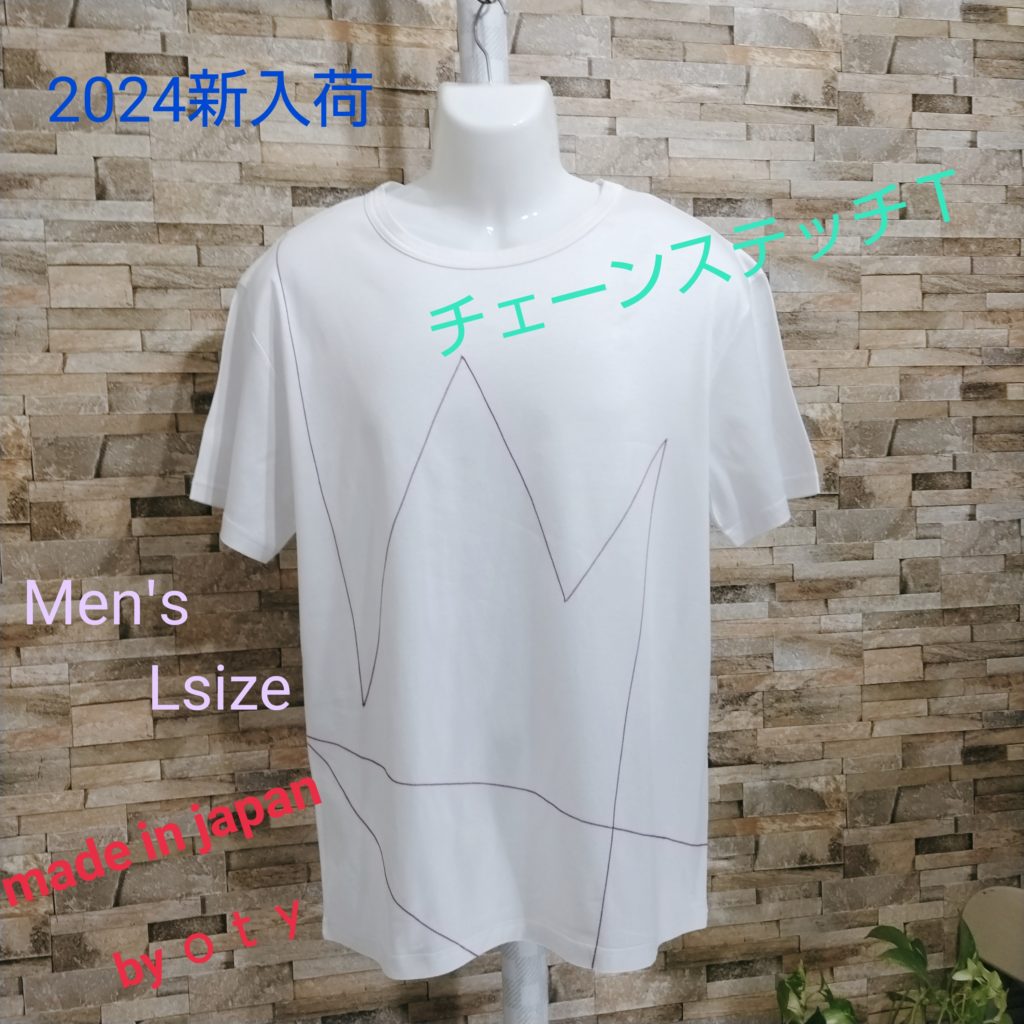 メンズLサイズの白ベースの日本国内製造の1点物Wide幅Tシャツです。身幅、肩幅がゆったり目のスタイルです。白の綿50%、ポリエステル50%の清涼感のある天竺生地です。前身前面にパープルの糸でチェーンステッチを大胆に施した1点物Tシャツです。衿ぐりは共地のバインダー仕様。袖口、裾は二本針仕様。製造工程上、ONEWASHしています。製品洗いが苦手な方はご遠慮ください。