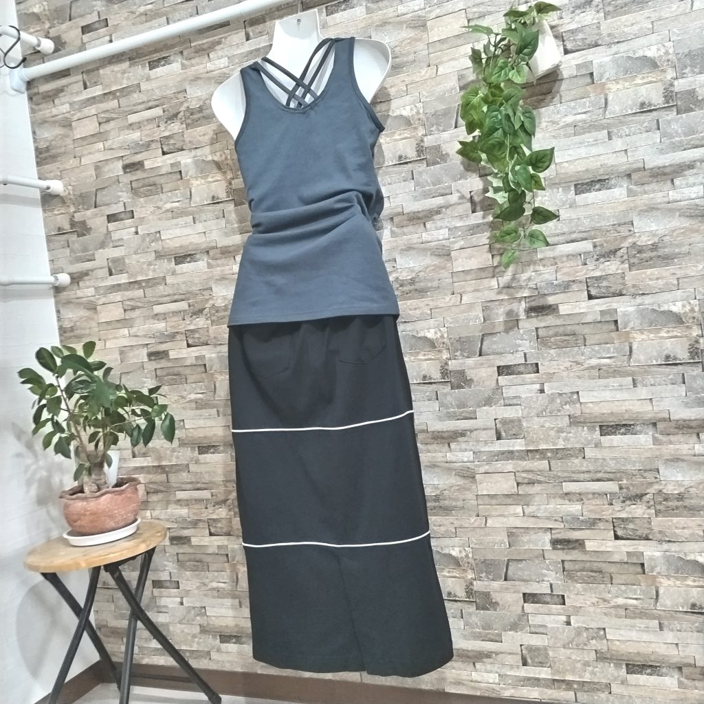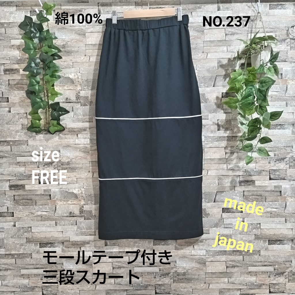 綿100%の天竺生地の三段デザインのスカートです。。日本製。カラーはbブラックでサイズはFREEです。段差にはモールテープをあしらっています。ウエストはゴム仕様。バックにはポケットを二つ配置。後ろ裾中央にはベンツタイプのスリット。歩く際にも楽に歩けます。裏地は付いておりません。