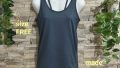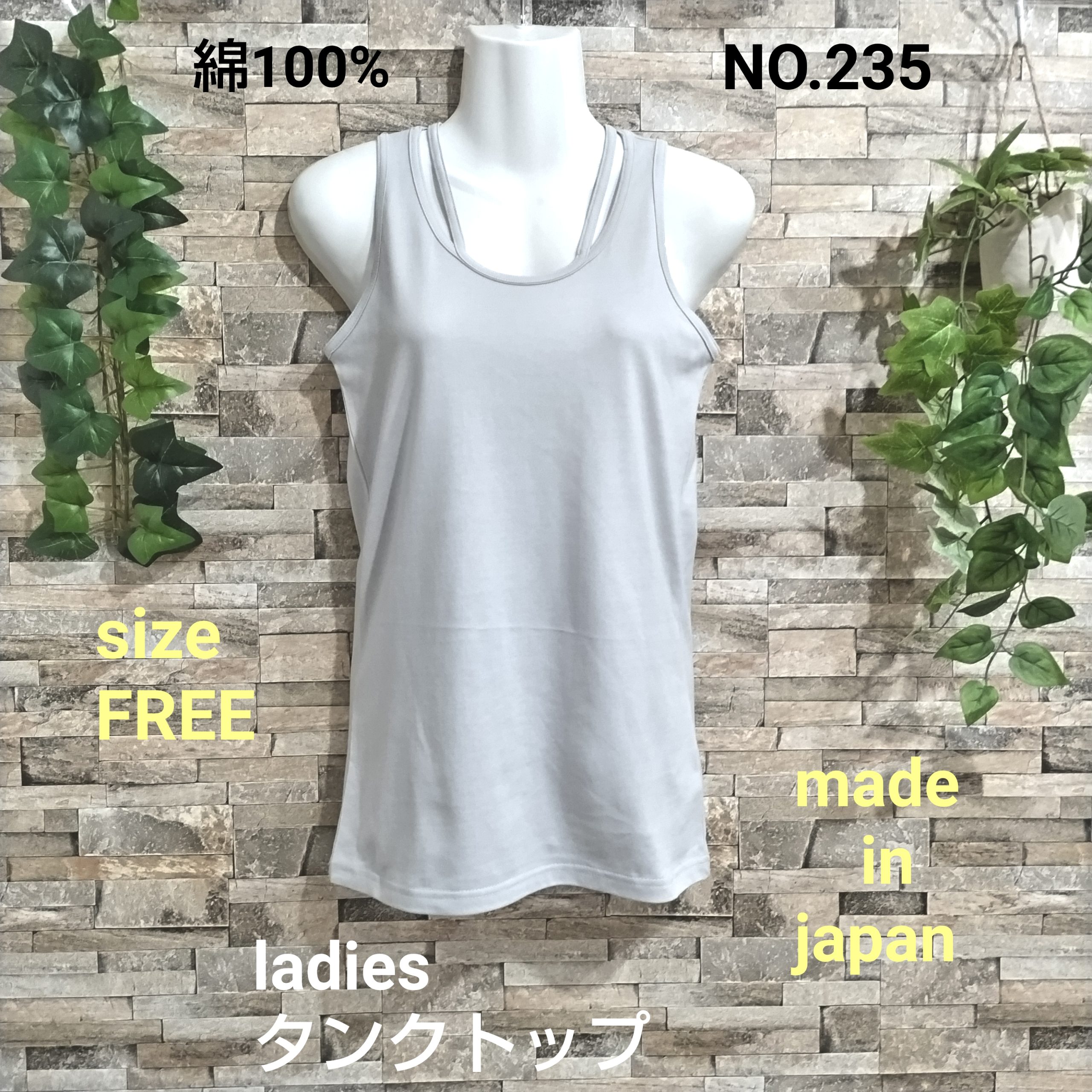 綿100%の天竺生地のタンクトップ。日本製。カラーはグレージュでサイズはFREEです。衿ぐりは共地バインダーを使用。肌触りがよく、これからの季節にはぴったりの商品です。前ひも、後ろひもは独特に交差しており、後ろ姿にかわいく、おしゃれにインパクトを与える一品です。