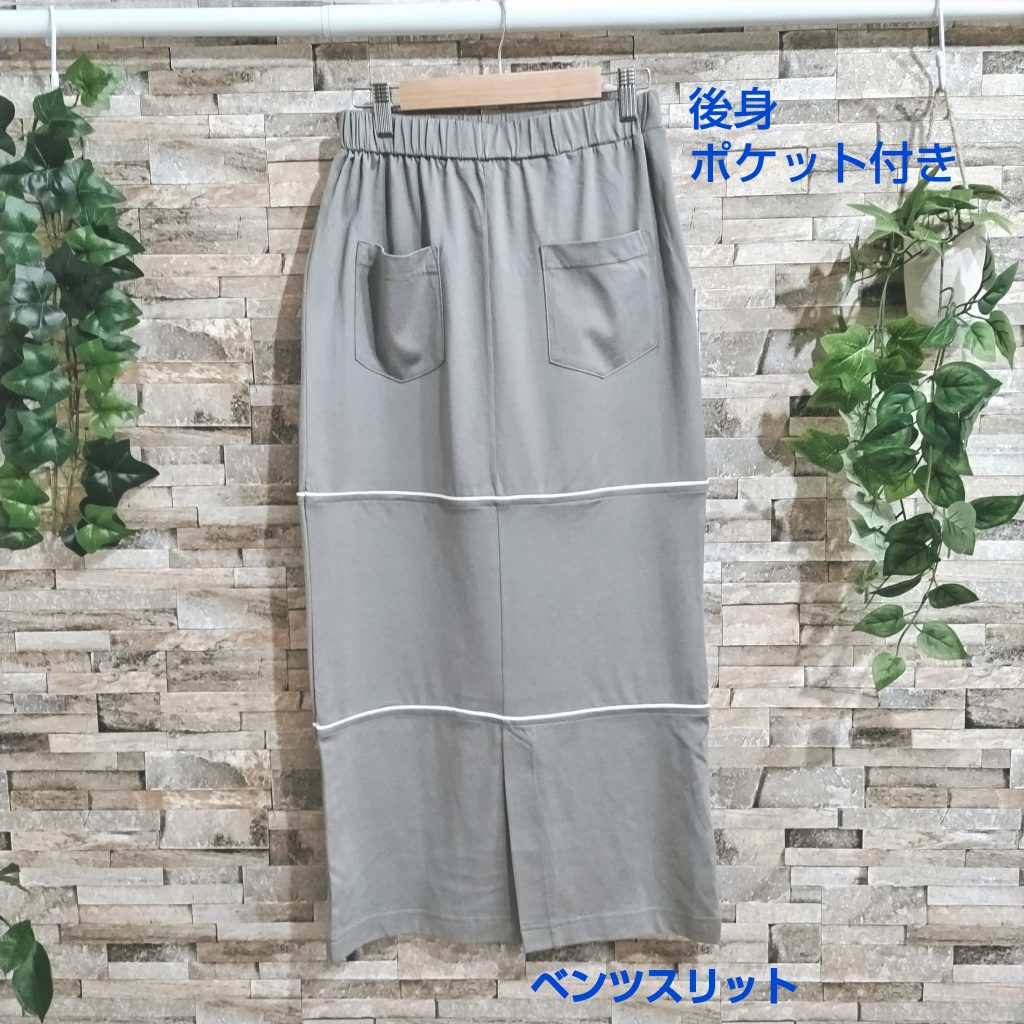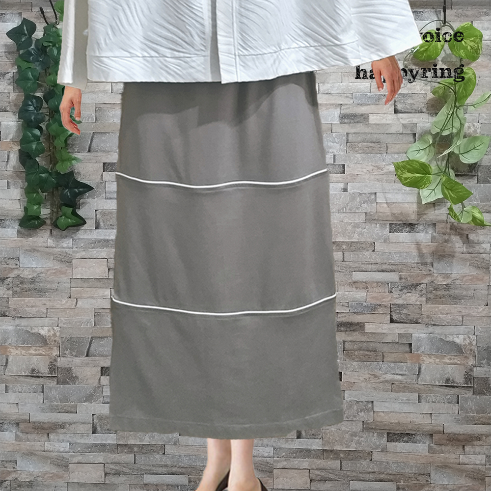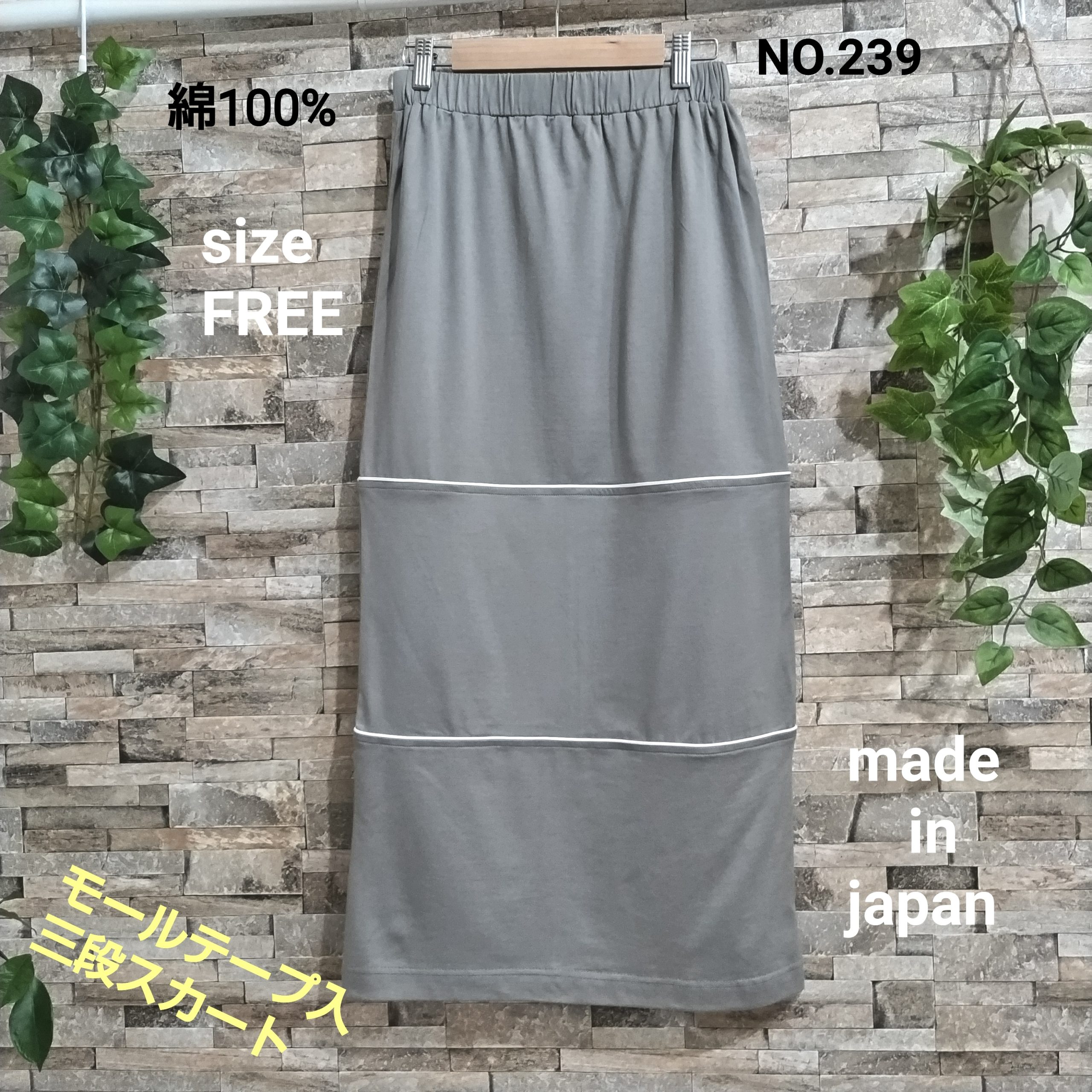 綿100%の天竺生地の三段デザインのスカートです。。日本製。カラーはグレージュでサイズはFREEです。段差にはモールテープをあしらっています。ウエストはゴム仕様。バックにはポケットを二つ配置。後ろ裾中央にはベンツタイプのスリット。歩く際にも楽に歩けます。裏地は付いておりません。