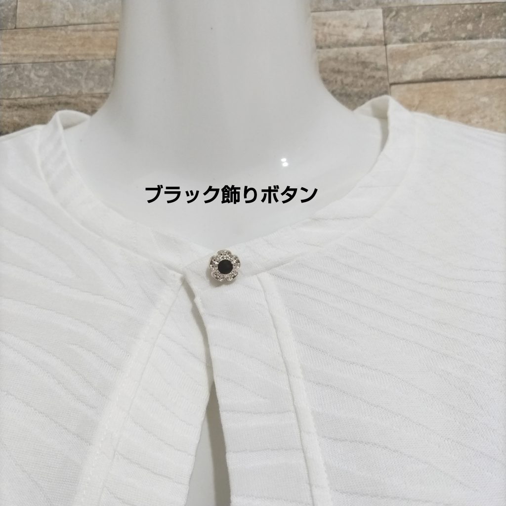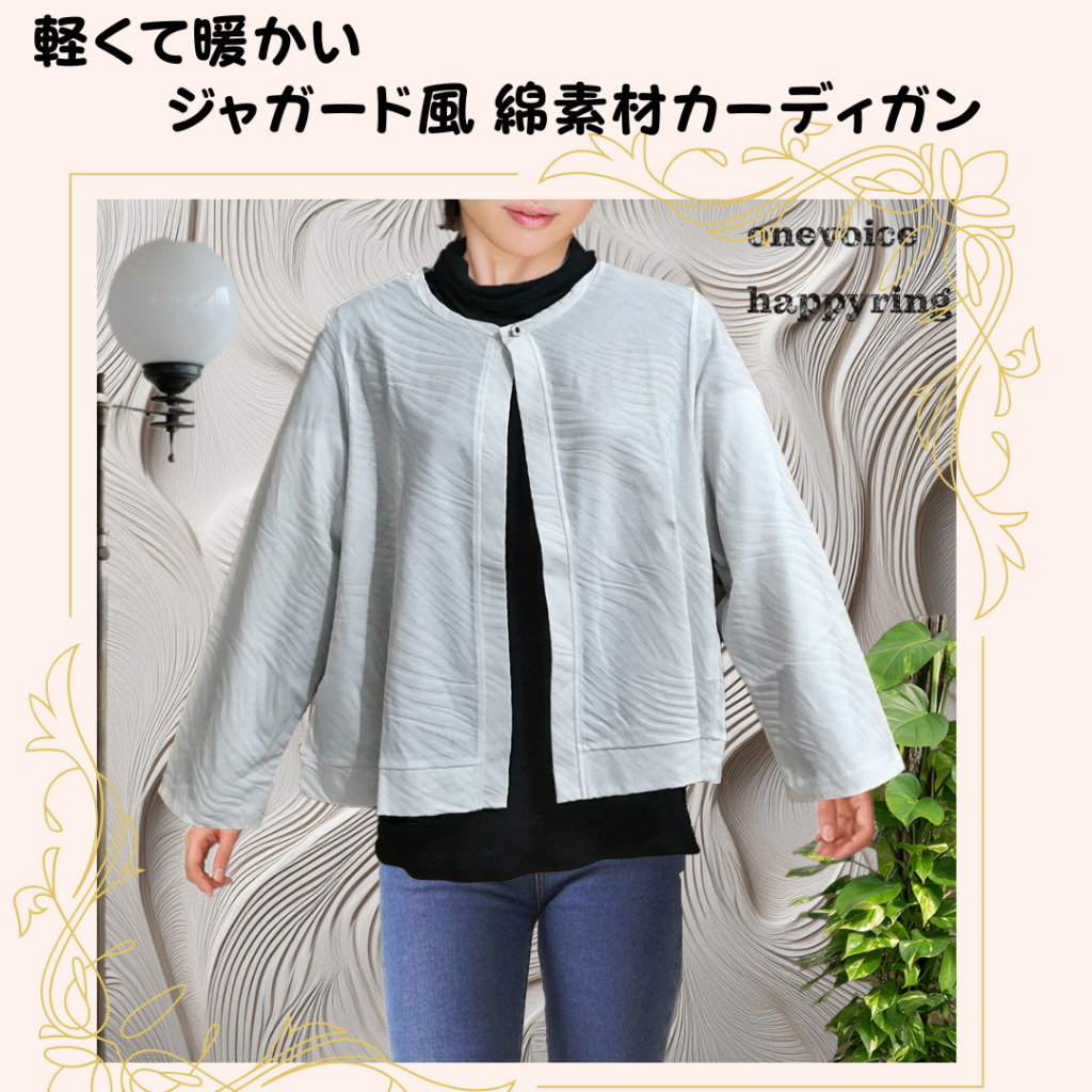 綿100%の天竺生地のジャガード風のボレロカーディガンです。日本製。カラーはーホワイトでサイズはFREEです。衿のみ一つのホックの開閉タイプで中央の黒い花デザインの飾りボタンが特徴です。今時期エアコンの利きすぎたちょっとした空間にも重宝します。