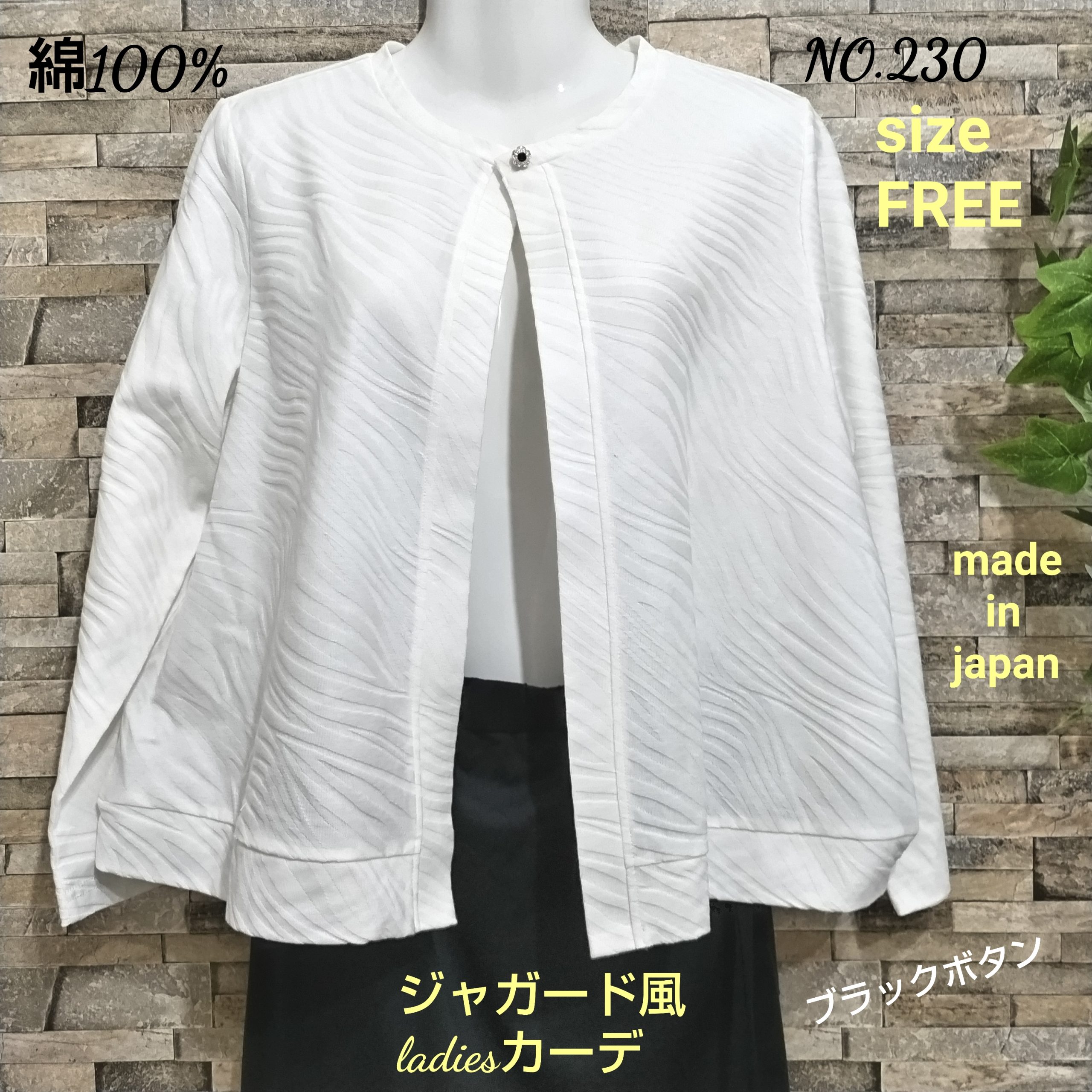 綿100%の天竺生地のジャガード風のボレロカーディガンです。日本製。カラーはーホワイトでサイズはFREEです。衿のみ一つのホックの開閉タイプで中央の黒い花デザインの飾りボタンが特徴です。今時期エアコンの利きすぎたちょっとした空間にも重宝します。