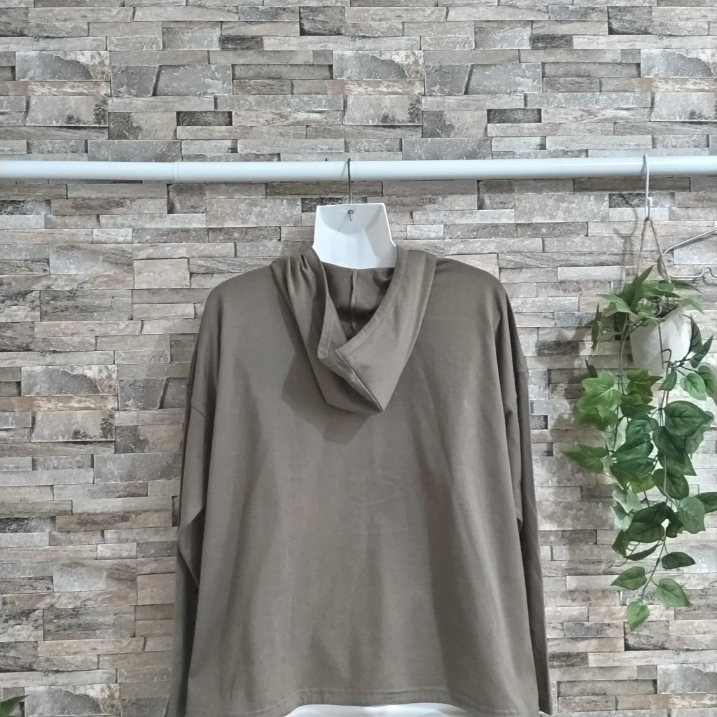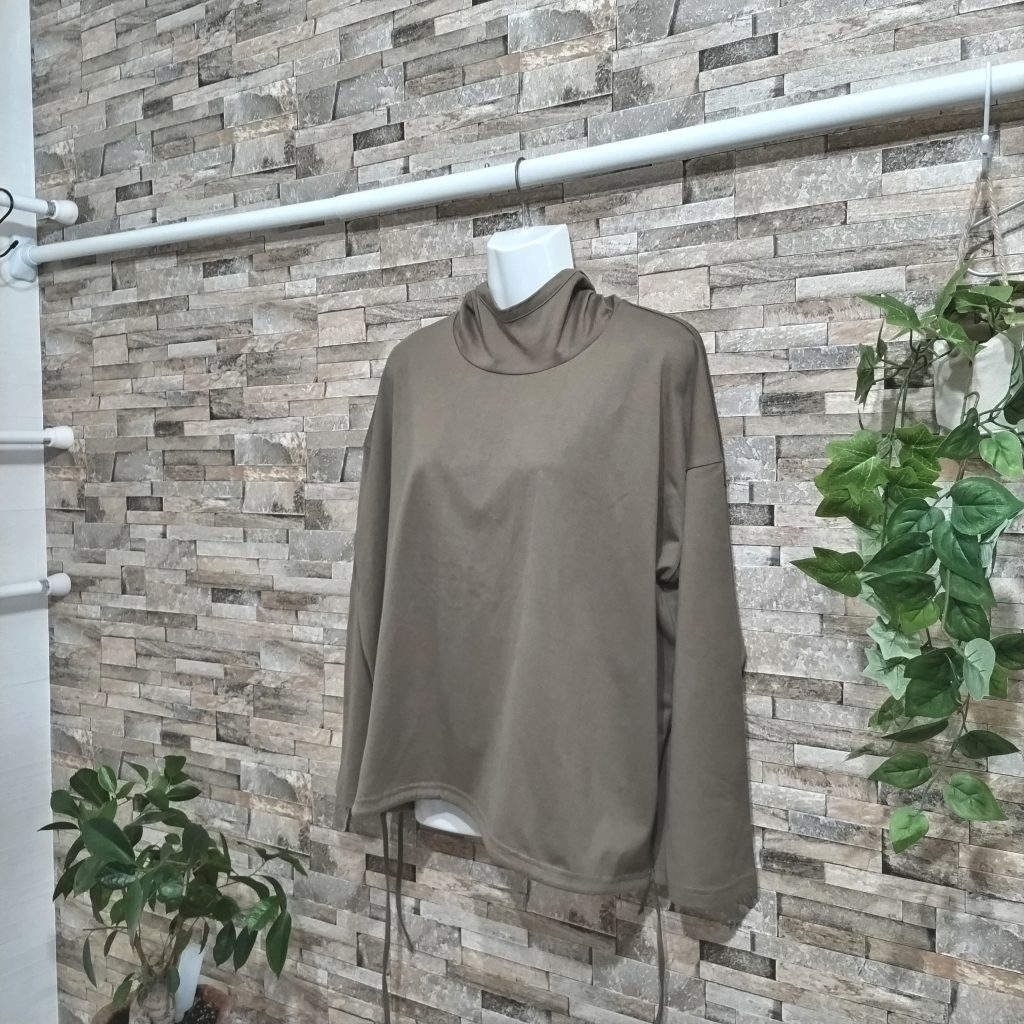 1点物の綿100%の天竺生地のレディースパーカーです。日本製。カラーはブラウン系カーキです。サイズはFREEです特徴は。首回りがハイネックに仕上がって、フードと一体になっています。袖口、裾は二本針仕様。裾はスリット&ひも付き。生地自体が天竺生地で裏毛と違って薄いので