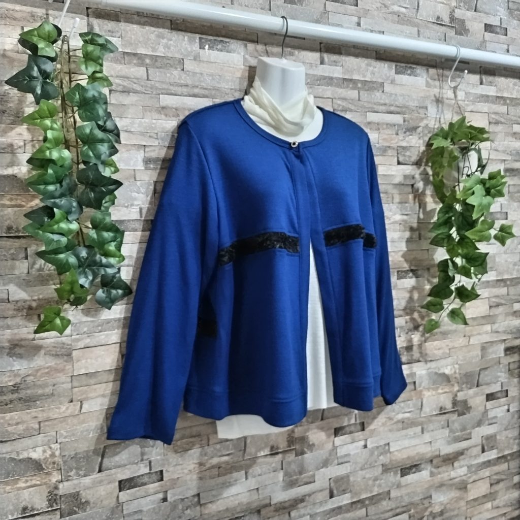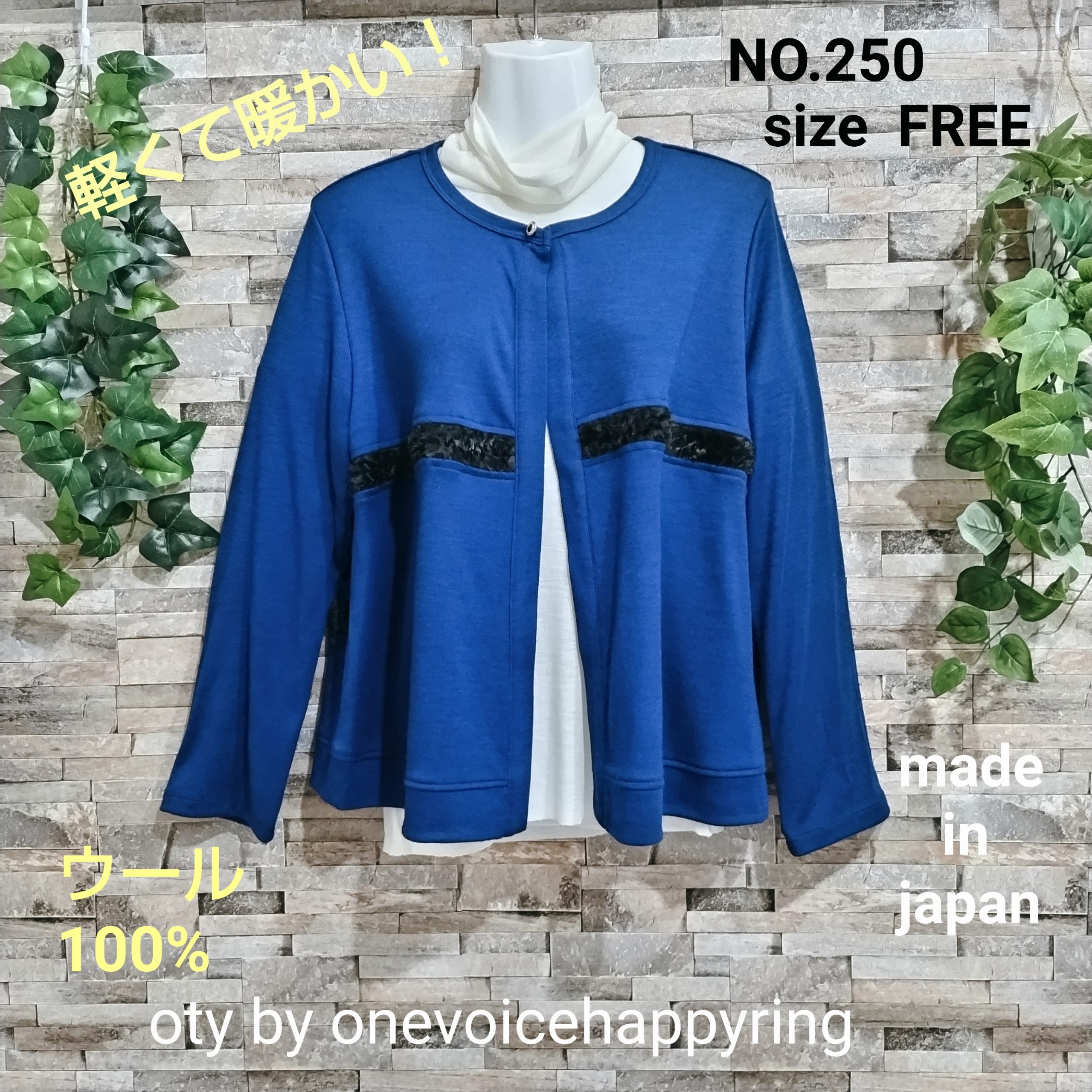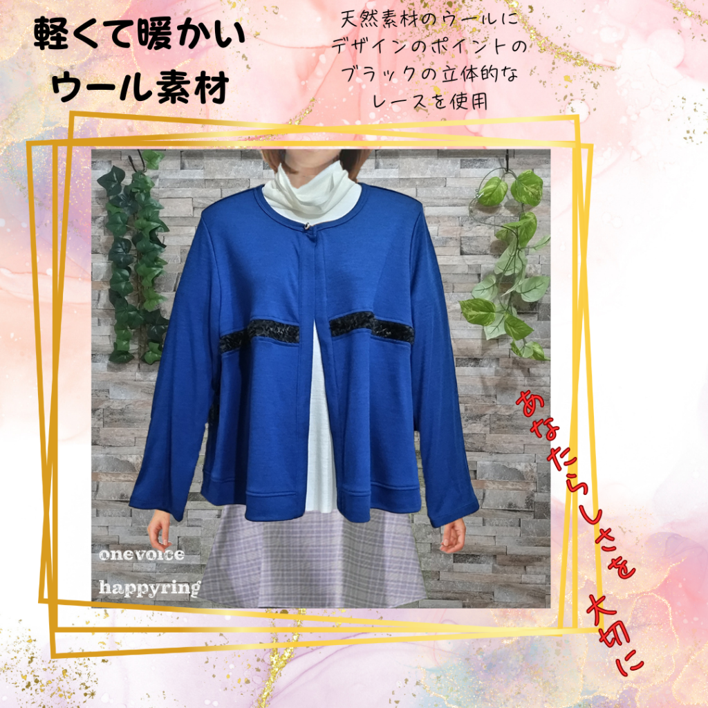ウール100%生地の天竺編みのカーディガンです。日本製。カラーはーブルーでサイズはFREEです。衿のみ一つのホックの開閉タイプで中央の黒い花デザインの飾りボタン。胸元&後ろ身には黒のレース生地をアクセントにデザインしています。薄くて軽い素材にウールならではの保温性も兼ね備えています。