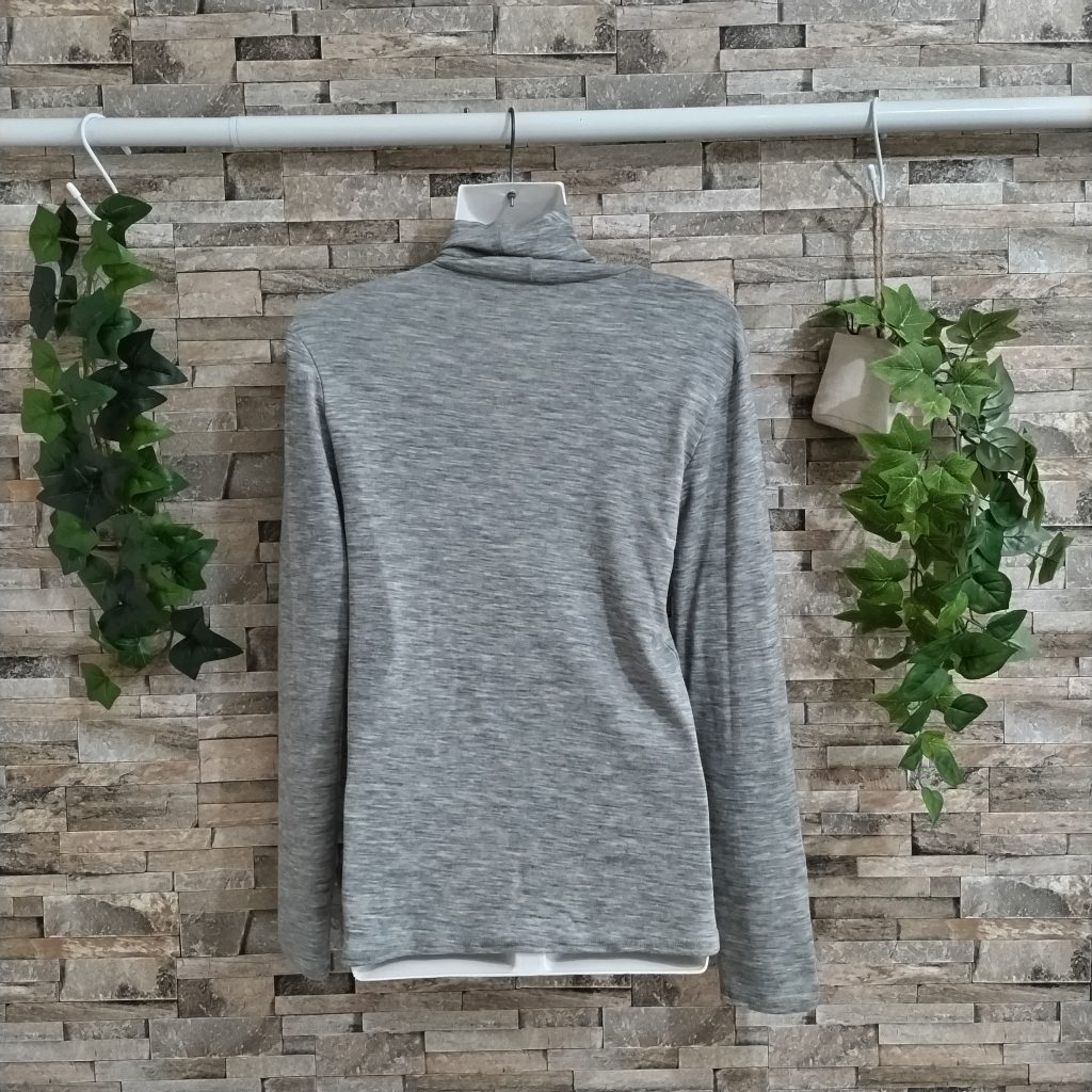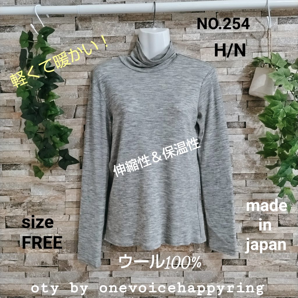 ウール100%生地の天竺編みのハイネックです。日本製。カラーは杢グレーでサイズはFREEです。「シンプル イズ ベスト!」のデザイン。衿、袖口、裾は細二本針仕様。薄くて軽い素材にウールならではの伸縮性&保温性&フィット感も兼ね備えています。