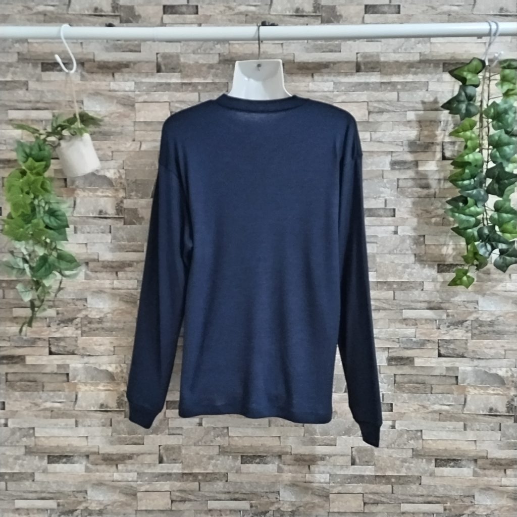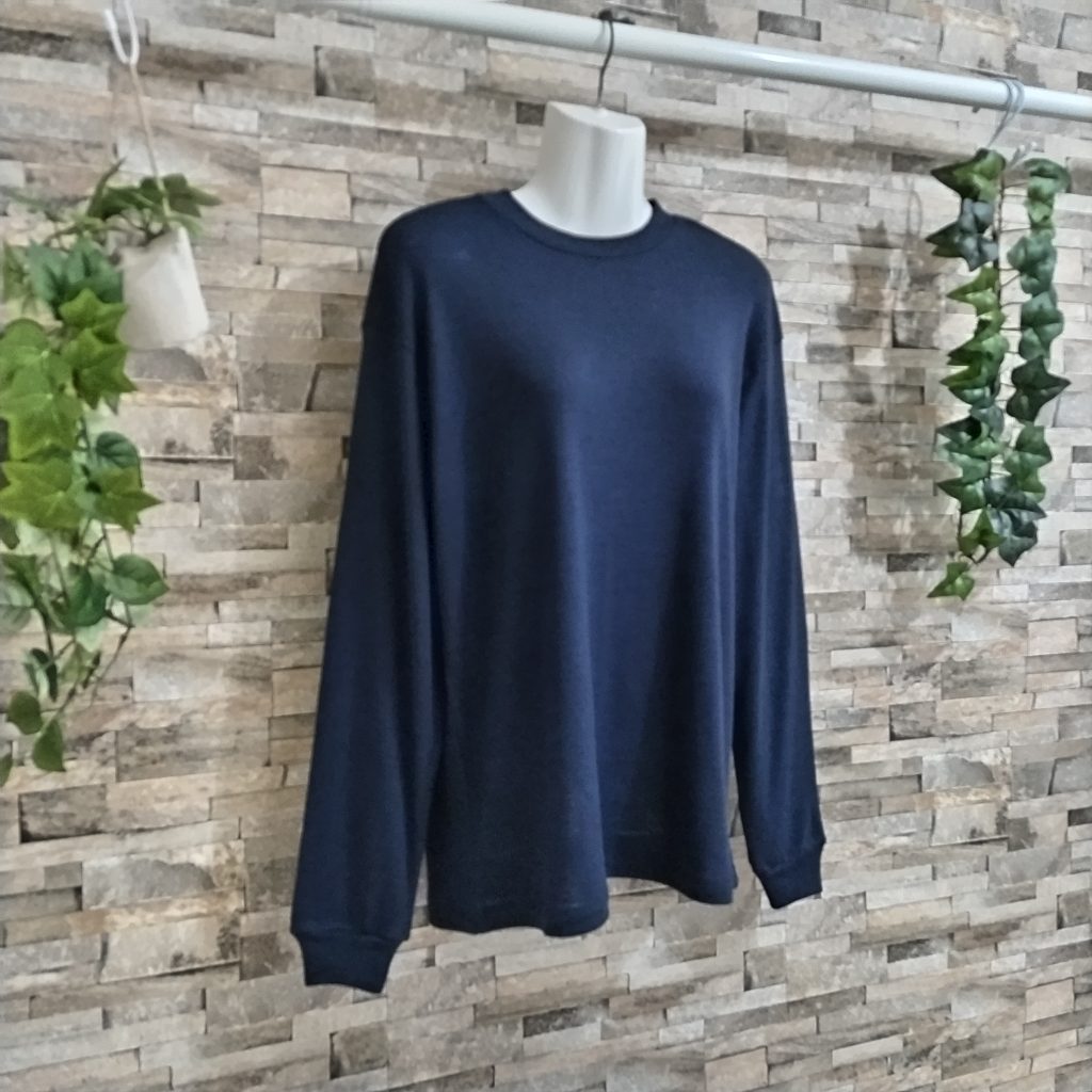 ウール100%生地の天竺編みの共地の付け衿、袖口も付けのクルーネックです。日本製。カラーはネイビーでサイズはFREEです。「シンプル イズ ベスト!」のデザイン。裾は細二本針仕様。薄くて軽い素材にウールならではの伸縮性&保温性も兼ね備えています。