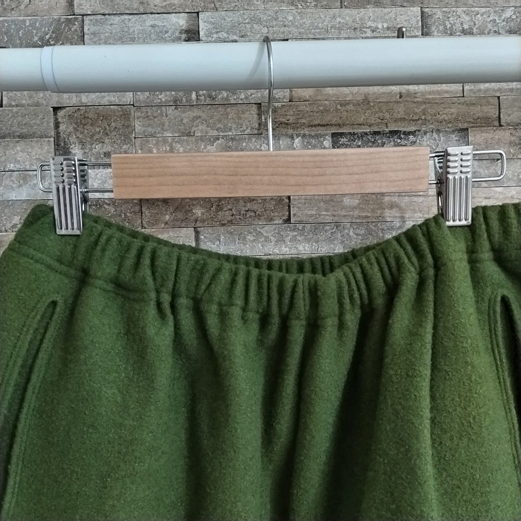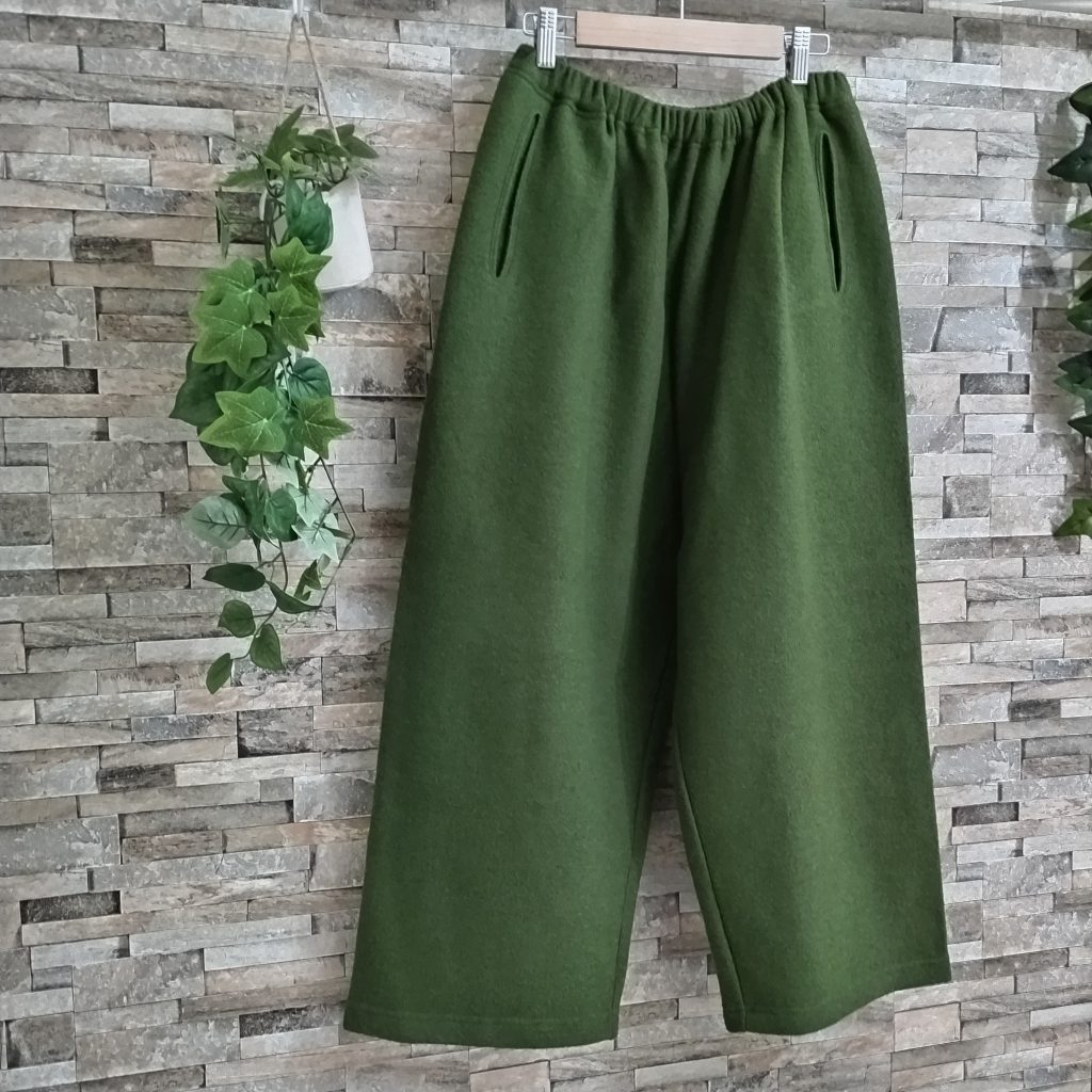 素材は圧縮ウール100%生地のパンツです。日本製。カラーはーグリーンでサイズはFREEです。ウエストはゴムで前身にポケットが付いています。「シンプル イズ ベスト!」な一点です。