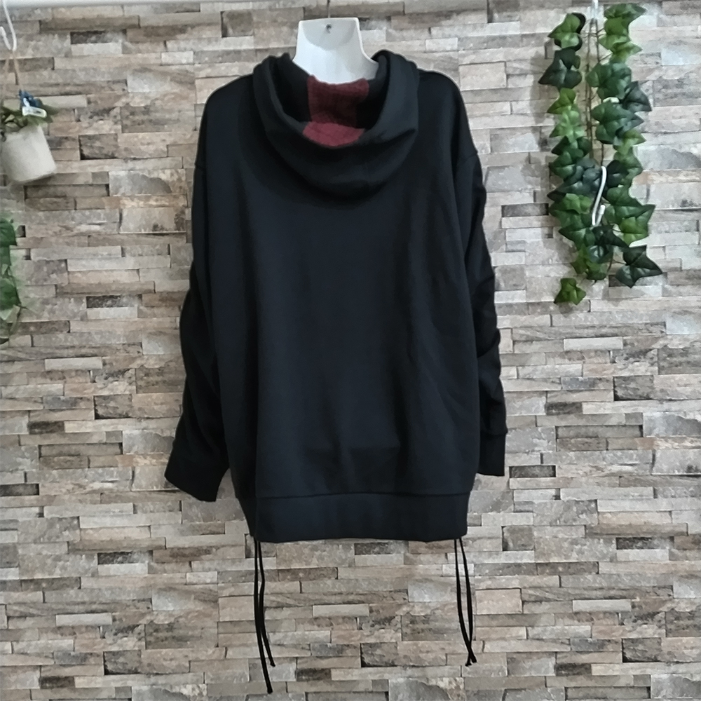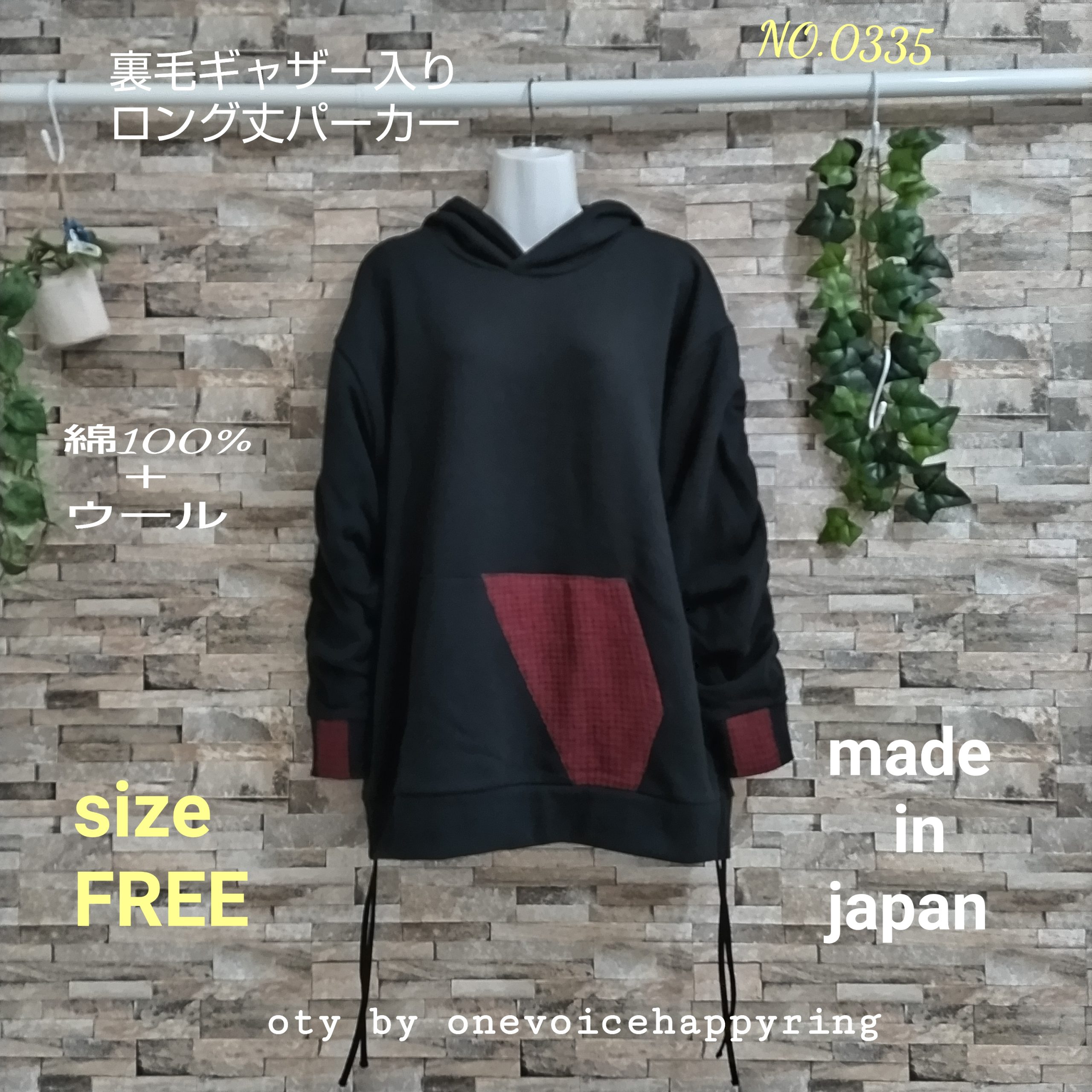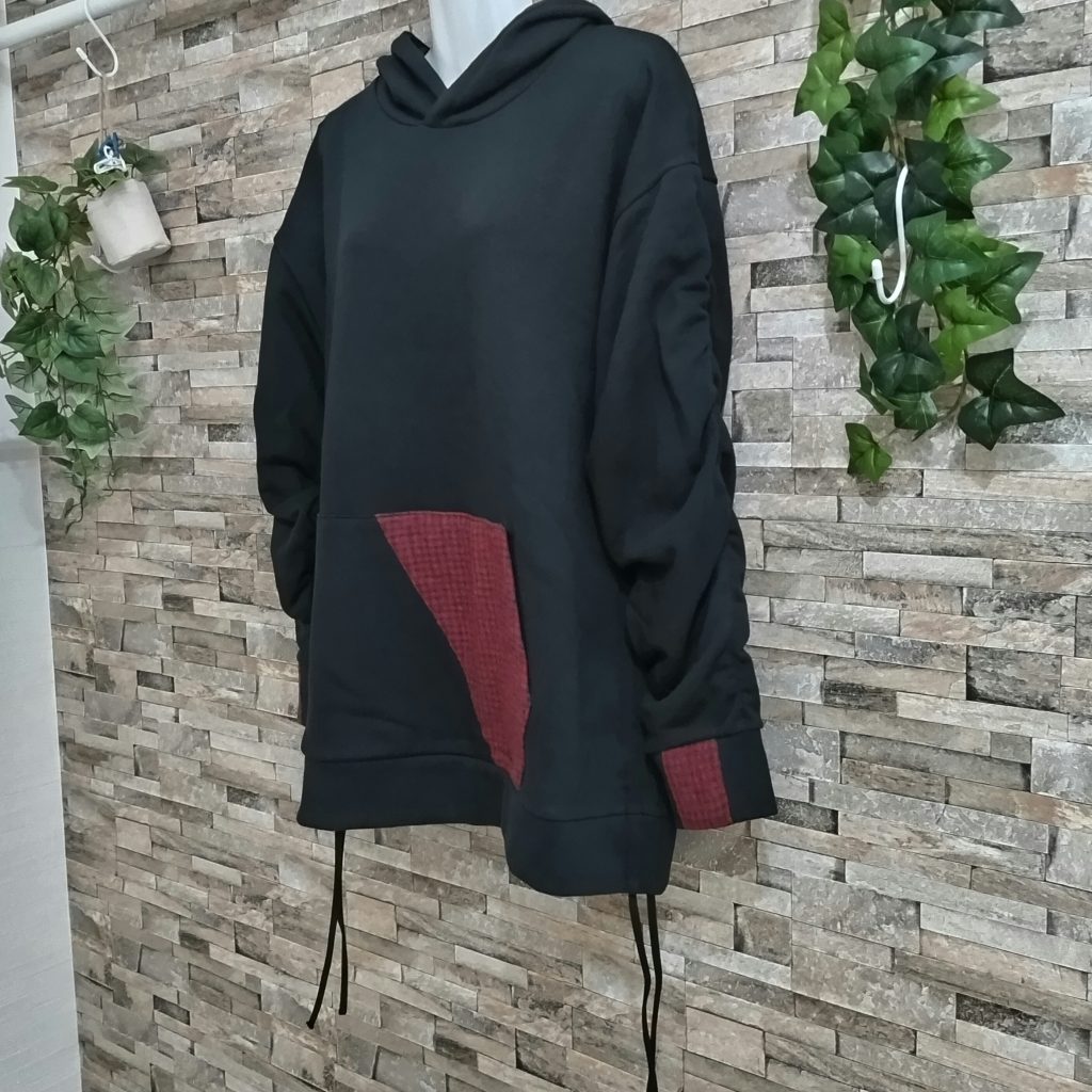 裏毛のレディースパーカーです。サイズはLサイズ相当。色はブラックです。生地自体は綿100%の裏毛ですがこれからの季節、またオールシーズン十分対応できる1品です。ポケットは定番の飽きのこないカンガルーポケット。ポケットの半分に赤のチェックのウール生地をつけた斬新な見栄え!フードも三枚ハギの二重仕様。裏面中央部分にも同じ生地を配置!袖口にも同素材を配置。また袖にはゴムでギャザーを施し、裾もひもでギャザーを寄せられる仕様です。ダボっと!着こなして、あなたの「可愛らしさ!」、「WILD OR COOL??」にも変化する一品です。