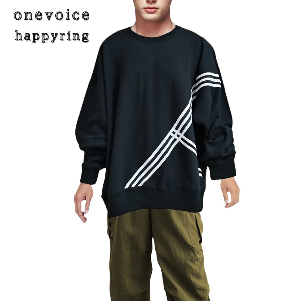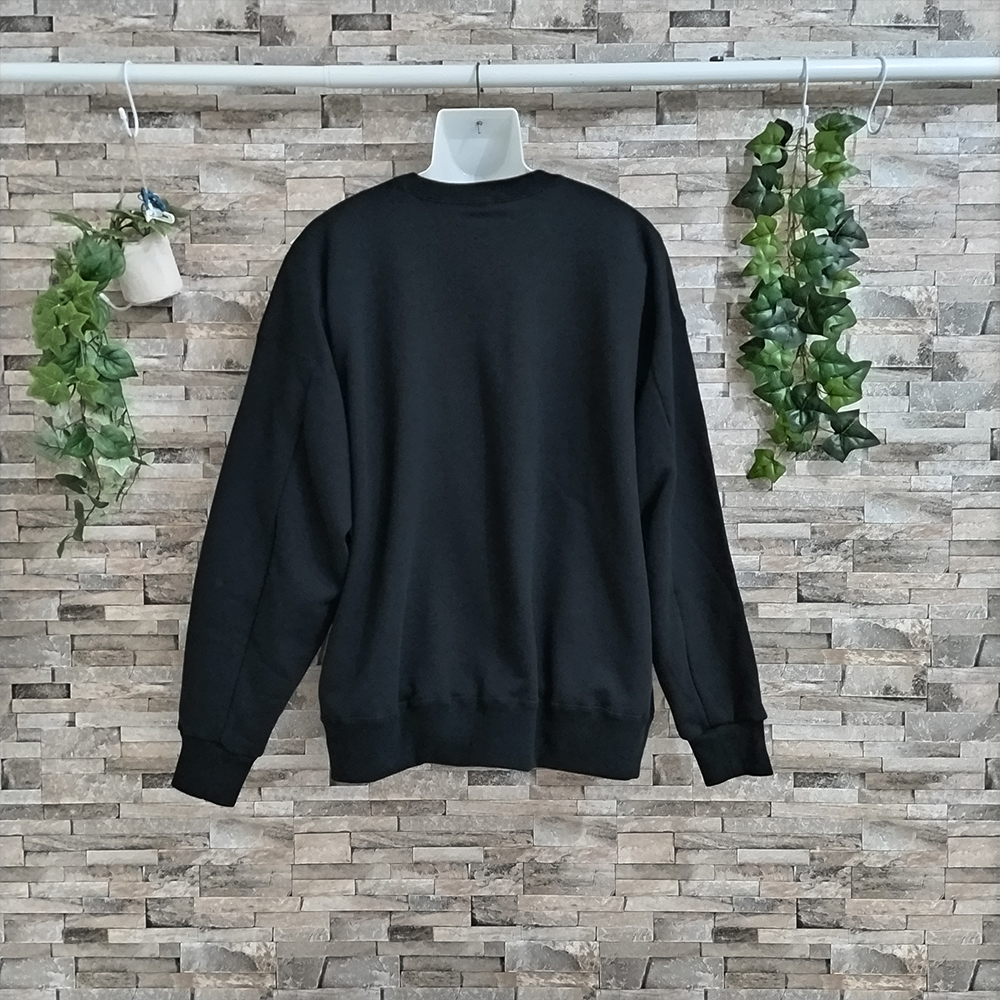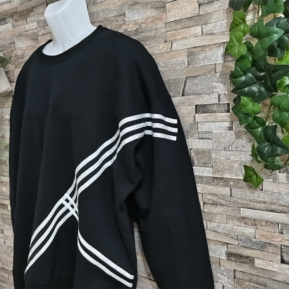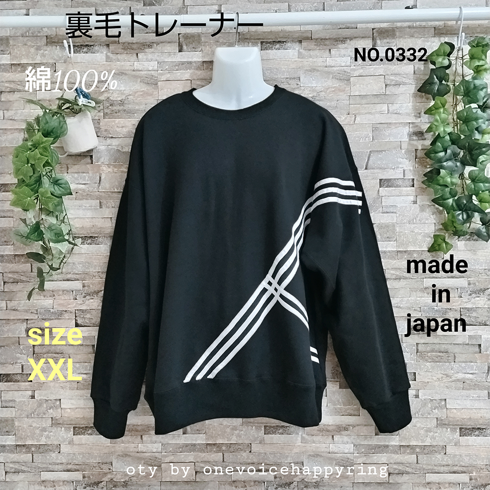 メンズXXLサイズの黒ベースの裏毛の日本国内製造の1点物トレーナーです。全体的にゆったり目の製品です。大柄の人にも着られる一品です。生地はしっかりした裏毛です。前身の右裾から左胸からAH、左袖へと白の三本のテープを叩きつけ、また、左裾へと二本のテープがインパクトを与えています。衿ぐり、袖口、裾は同色のテレコを使用し、またぎの二本針仕様。袖にハギが2つ入っています。身幅、肩幅、AHはゆったり目です。縫子さんの手間と量販品にはない遊び心のある一品です。