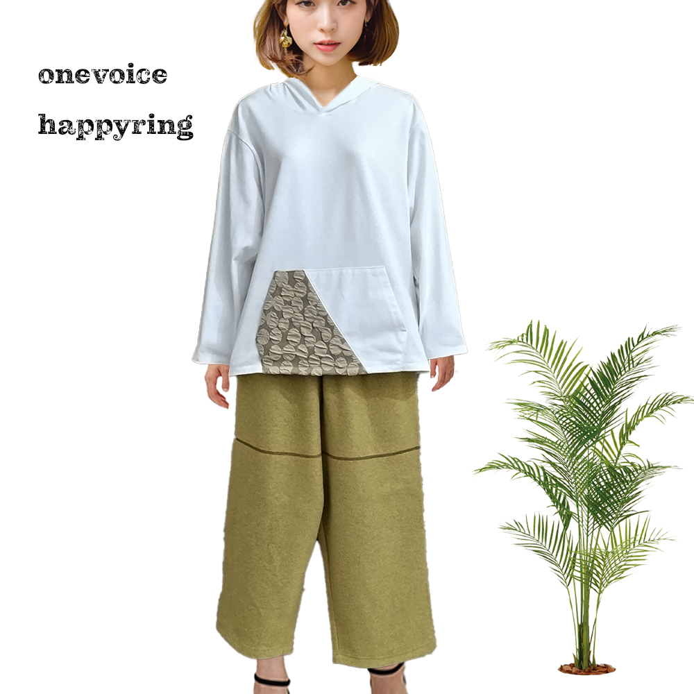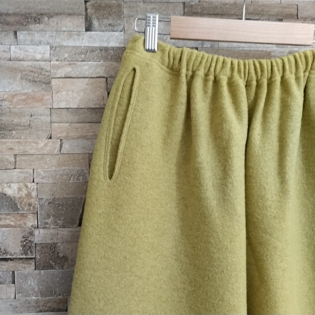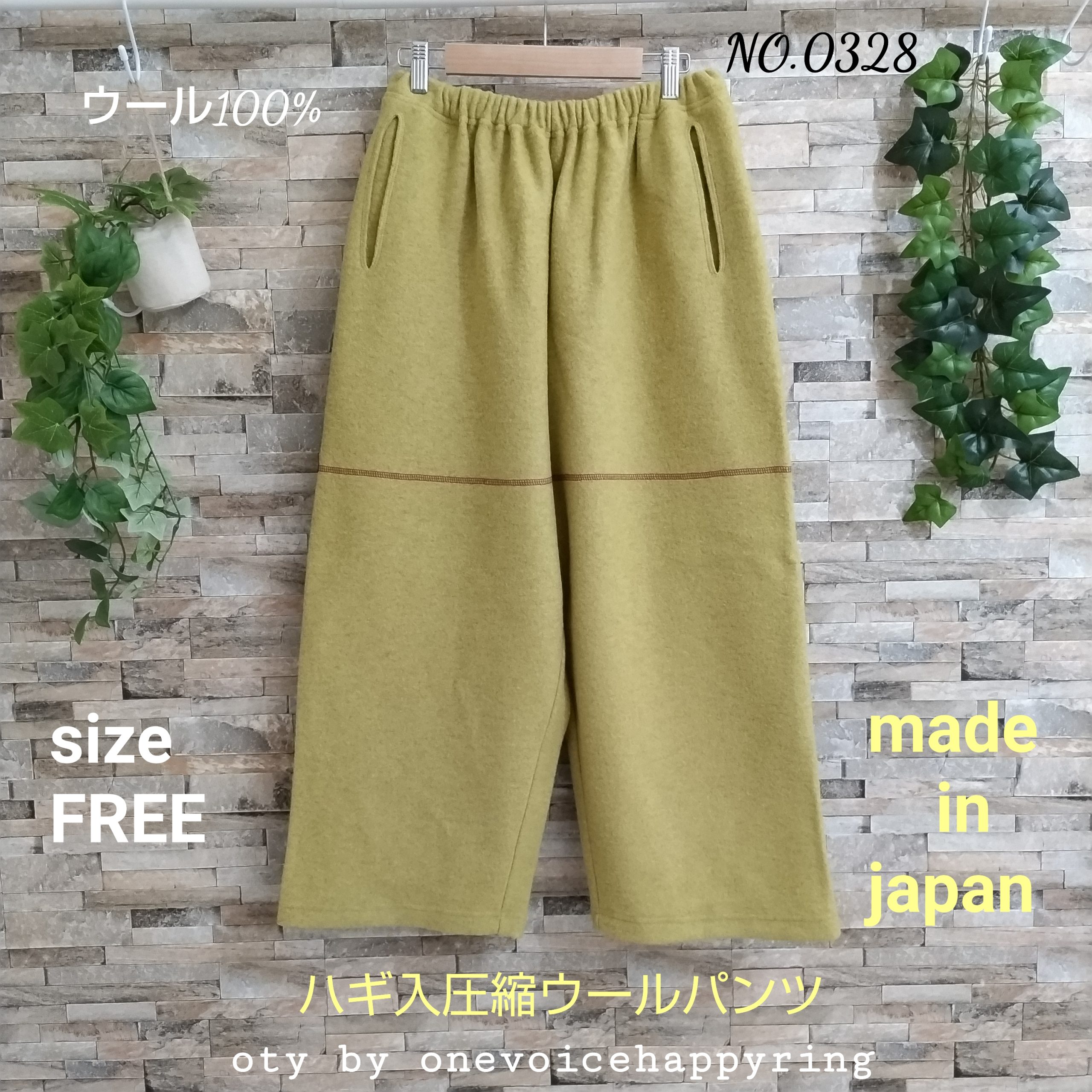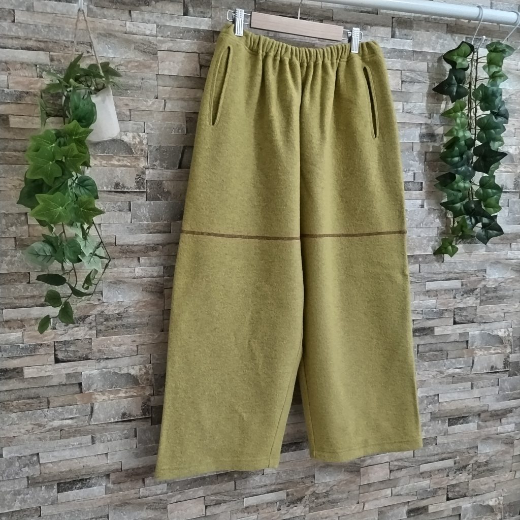 素材は圧縮ウール100%生地のパンツです。日本製。カラーはーイエローでサイズはFREEです。ウエストはゴムで前身にポケットが付いています。四枚の生地をはいで、ハギ目に三本針振りを配色糸で使用し存在感を穿いたあなたの存在感・かわいらしさ引き立たせます。