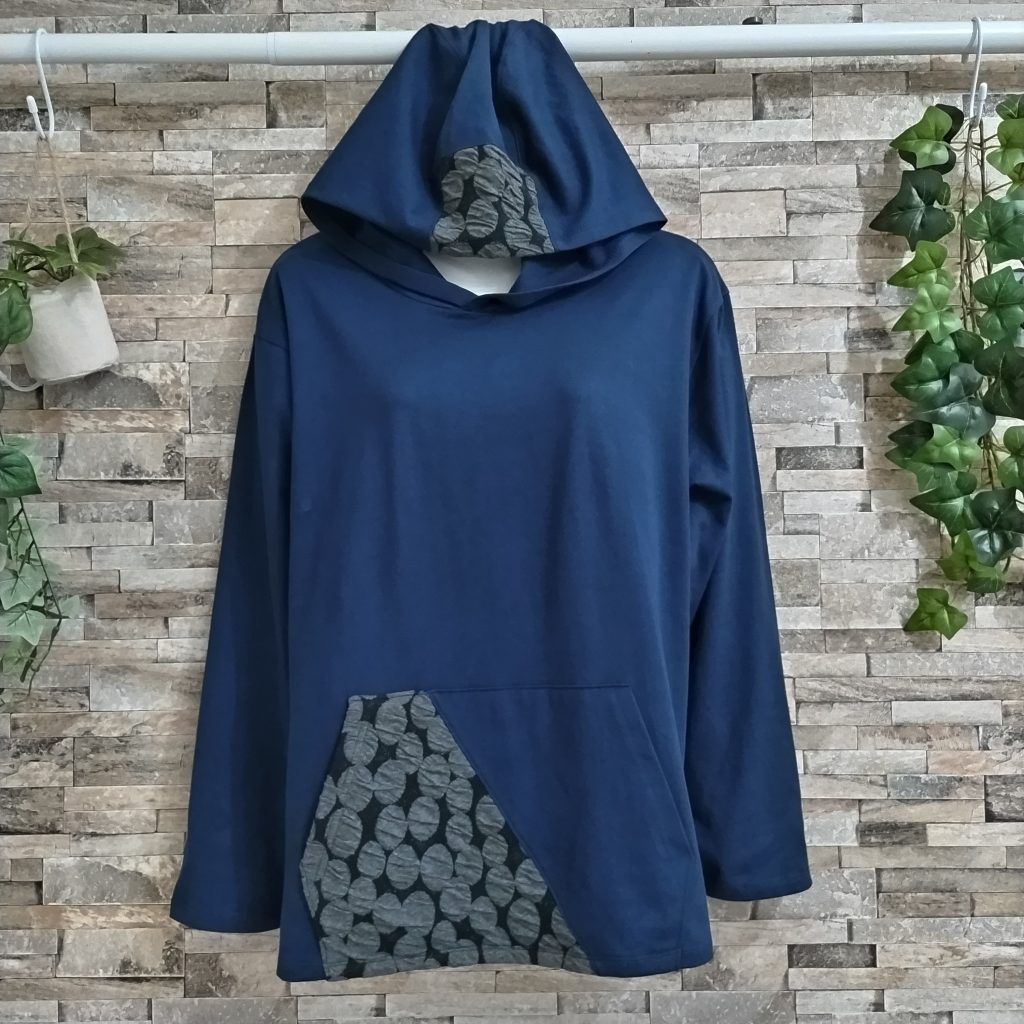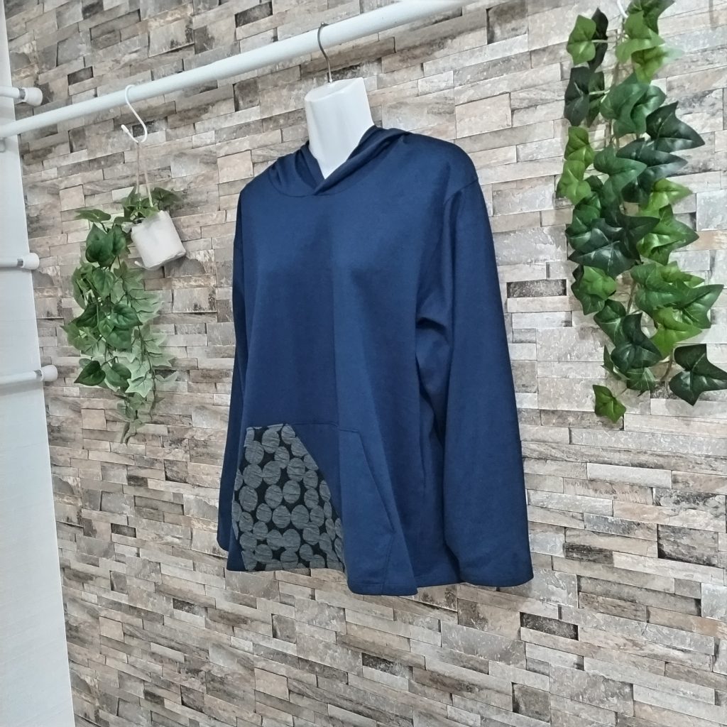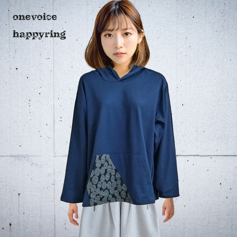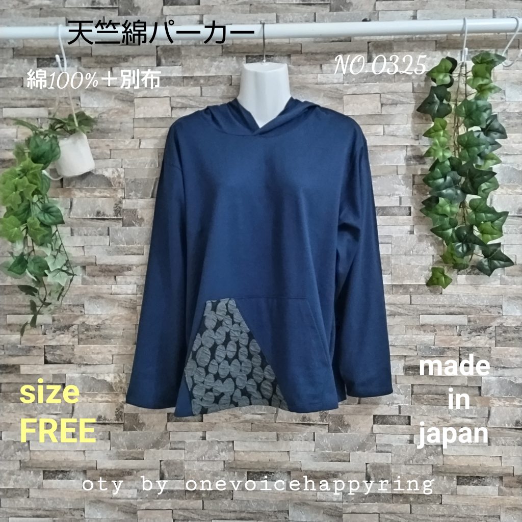 綿100%の天竺生地のレディースパーカーです。日本製。カラーはーブルーでサイズはFREEです。特徴はオーソドックスなカンガルーポケット。特徴はポケットの半分を黒の別素材を使用。フードのセンター先にも同様別素材をしようし、オーソドックス形ながらインパクトを与えています。袖口、裾は細二本針仕様。生地自体が天竺生地で裏毛と違って薄いので重ね着したり、いろいろなファッションにも使えます。