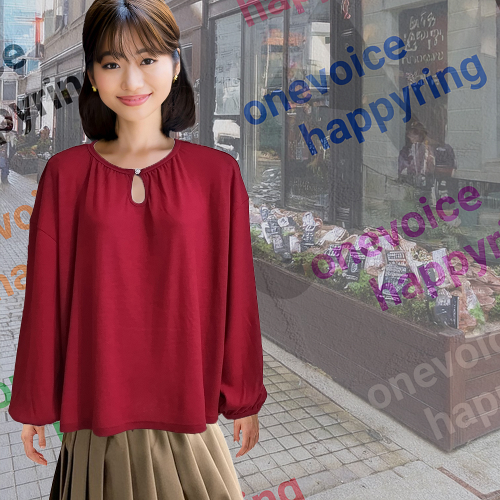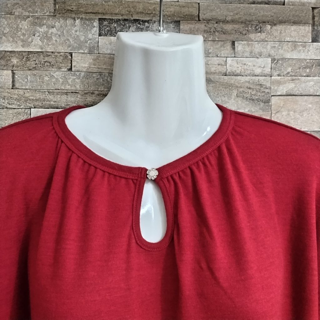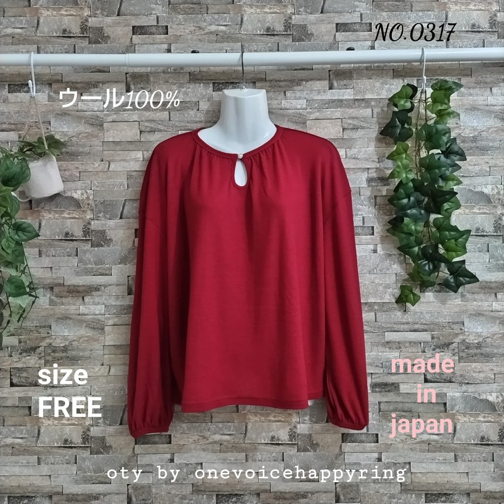 ウール100%生地の天竺編みのなみだループ・プルオーバーです。色はレッド。なみだループにはボタンがついて着やすくなっています。サイズはフリーサイズで日本製。衿・袖口にはギャザーが入れてあり、ふんわりデザイン。裾は二本針仕様。薄くて軽い素材にウールならではの伸縮性&保温性も兼ね備えています。