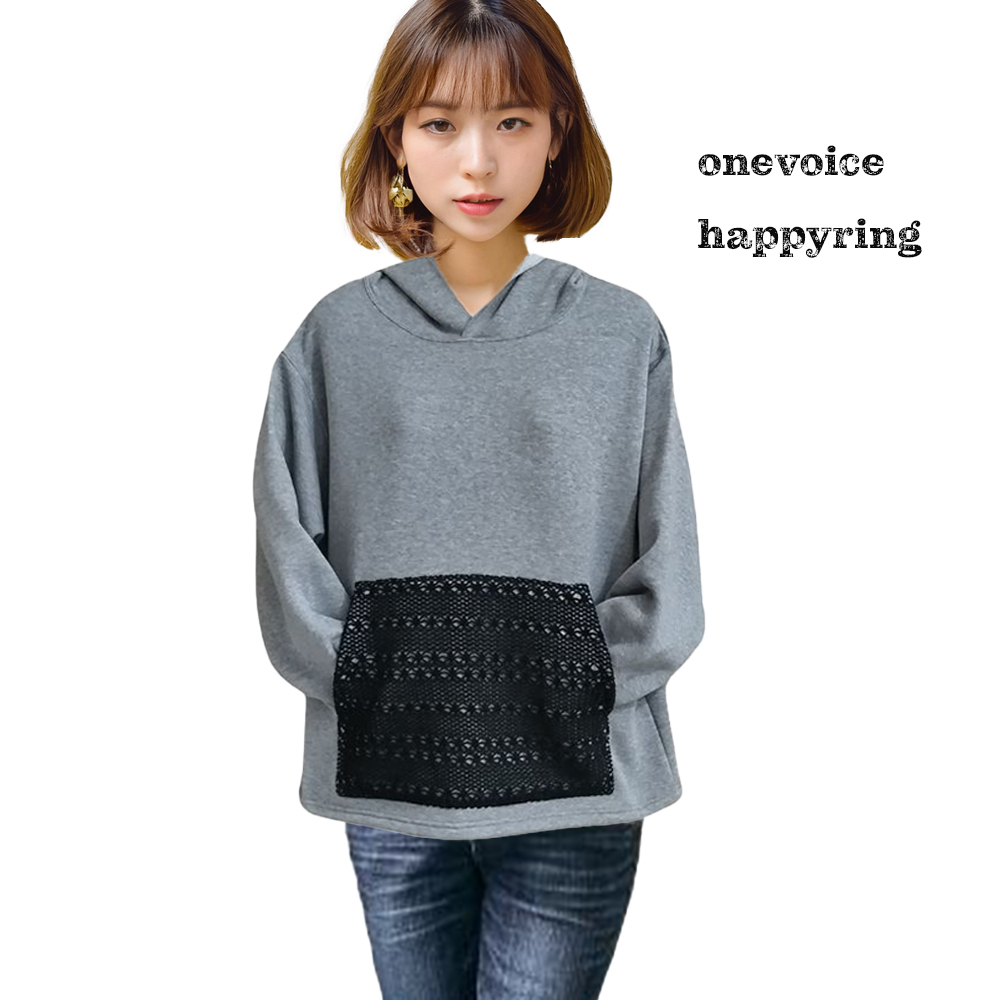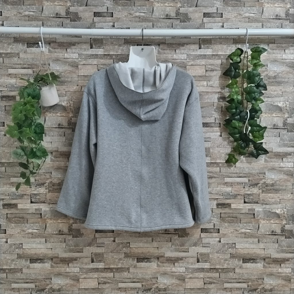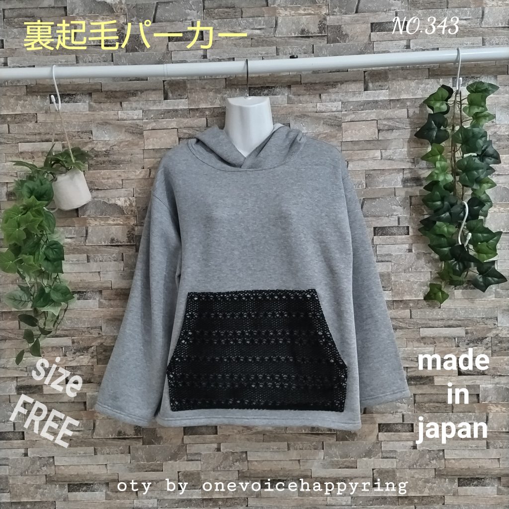 日本国内生産の裏起毛のレディースパーカーです。サイズはMサイズ相当。色はグレーです。生地は綿78%、ポリエステル22%のかるフワの裏起毛素材です。裏起毛なのでこれからの季節あたたかさをキープしてくれる1品です。ポケットは定番の飽きのこないカンガルーポケット。ポケットにはポリエステルのレースメッシュ生地をつけた斬新な見栄え!フードは一枚でフード縁は流行りのからロック仕様。衿・AH・背中・フードはまたぎの二本針仕様。身幅が広めなので、ゆったり感もあります。