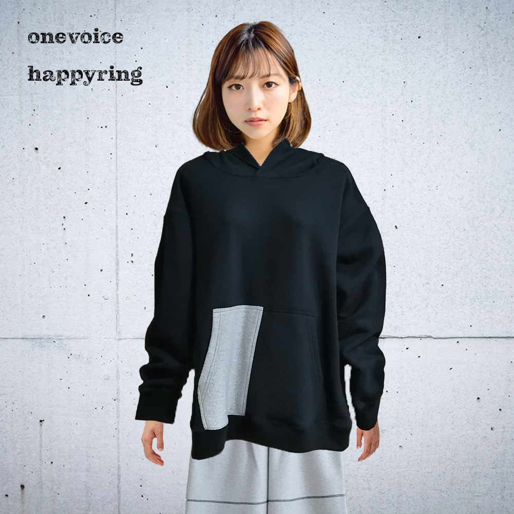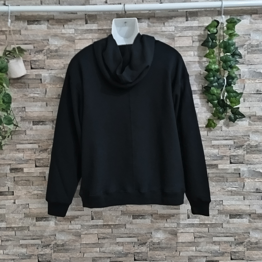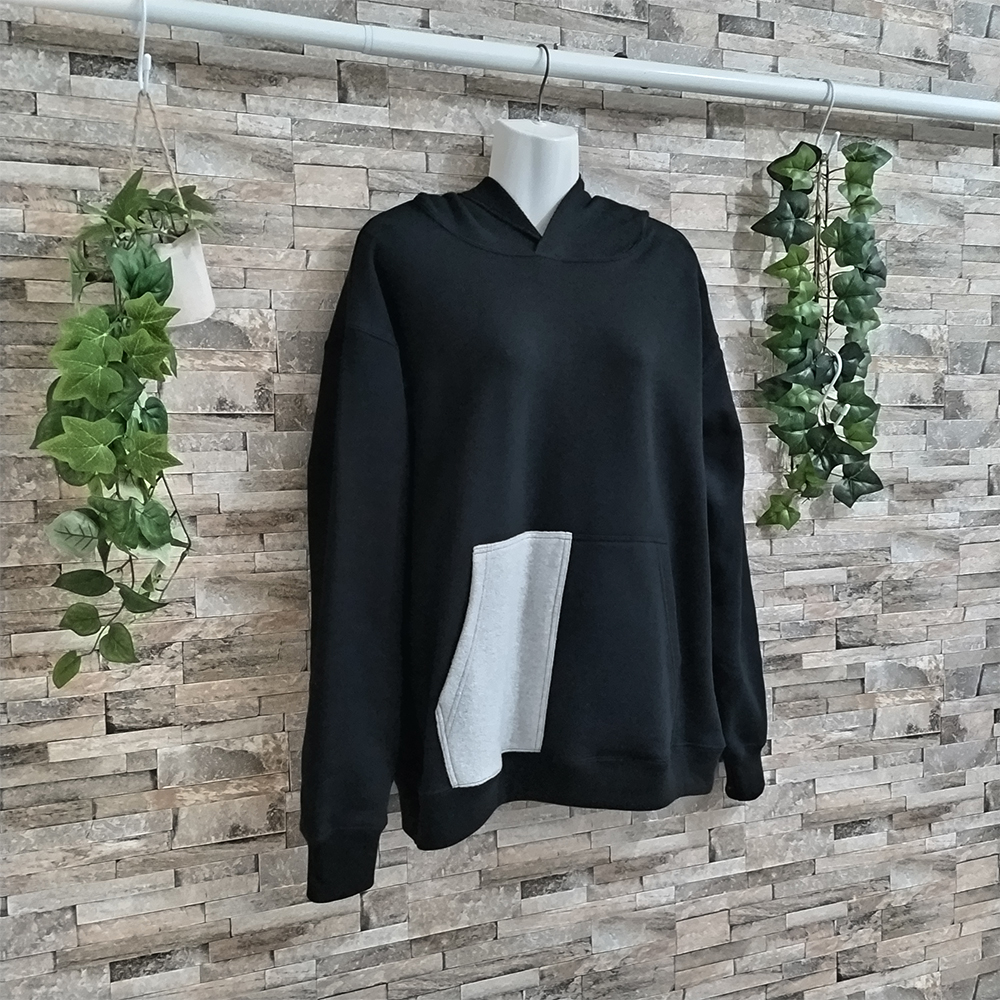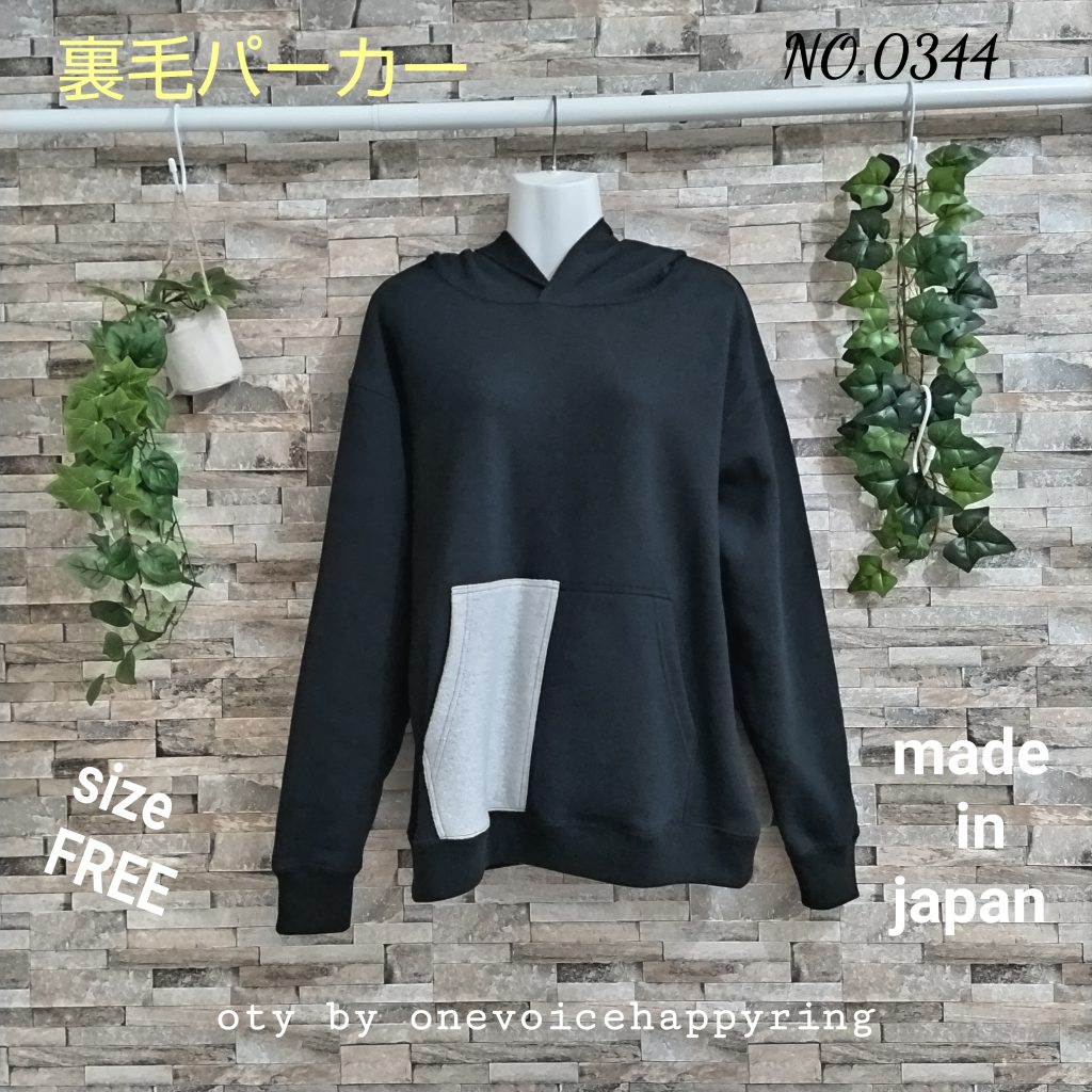 裏起毛のレディースパーカーです。サイズはMサイズ相当。色はブラックです。ボディー&テレコ生地は綿100%、別布ウール100%の裏毛素材です。裏毛なのでこれからの季節、どのような場面でも重宝してくれる1品です。ポケットは定番の飽きのこないカンガルーポケット。ポケット半面にはウール100%生地をつけた斬新な見栄え!フードは一枚でフード縁は流行りのからロック仕様。手首のテレコ部分には親指抜き仕様にしてあるので、そこから親指をだせば、手袋いらず!「だぼ、カワ!」で着こなしOK!の一品です。衿・AH・背中・フードはまたぎの二本針仕様。身幅が広めなので、ゆったり感もあります。