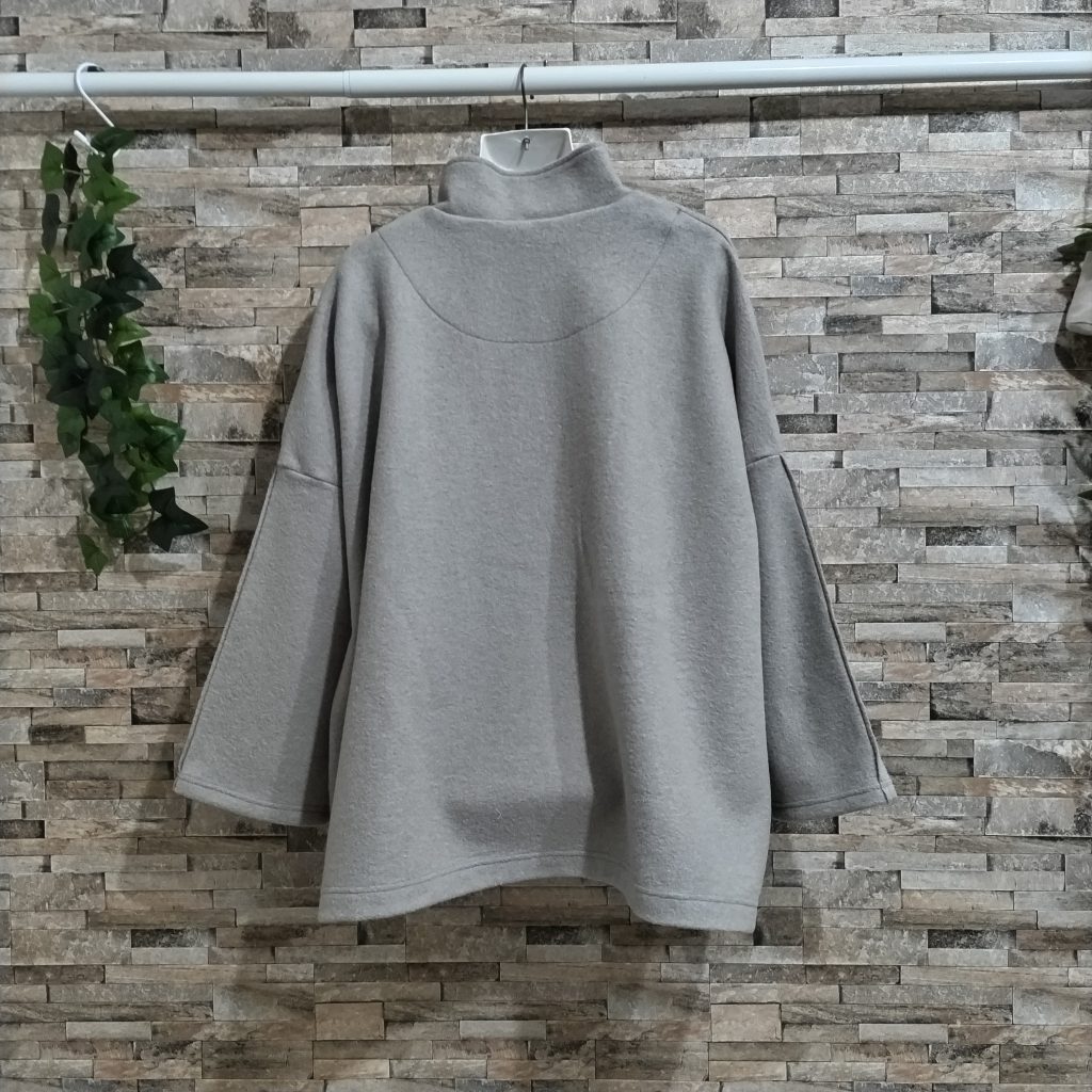 自社国内工場生産の圧縮ウールのハーフコートです。カラーはサンドベージュでサイズはFREEです。衿はスタンドタイプで前立て,後ろ見返しは断ち切り仕様。前身頃のポケットも断ち切り仕様で珍しい丸型ポケット。前立てにループホールを付けて木製ボタンを3つ配置。ポケット、後ろ見返しは茶色の生地を使用し、インパクトを与えています。袖は二枚ハギになっており、断ち切り仕様。