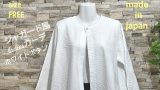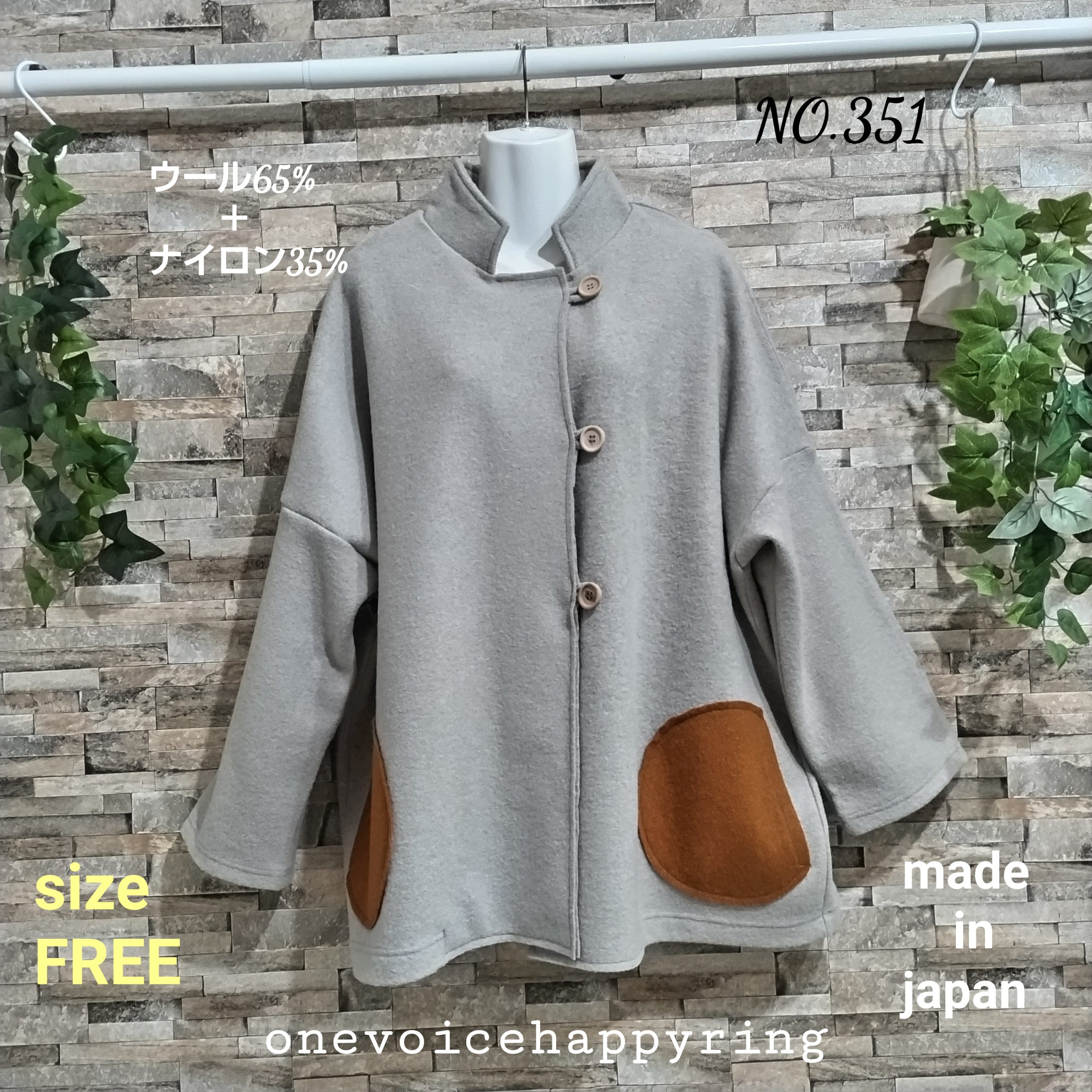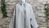 自社国内工場生産の圧縮ウールのハーフコートです。カラーはサンドベージュでサイズはFREEです。衿はスタンドタイプで前立て,後ろ見返しは断ち切り仕様。前身頃のポケットも断ち切り仕様で珍しい丸型ポケット。前立てにループホールを付けて木製ボタンを3つ配置。ポケット、後ろ見返しは茶色の生地を使用し、インパクトを与えています。袖は二枚ハギになっており、断ち切り仕様。