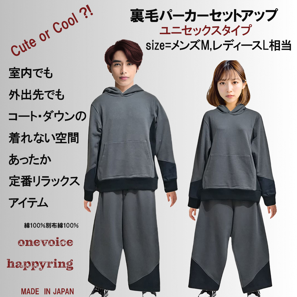 自社国内工場生産の裏毛のユニセックスタイプのセットアップです。フリーサイズ表記にしておりますが、サイズはメンズMサイズ相当。レディースはL相当です。色はメインはカーキで部分的に別布でブラックを使用しています。メイン生地自体は綿100%の裏毛ですが別布はテレコ生地を使用。これからの季節、またオールシーズン十分対応できる1品です。パーカーのポケットは定番の飽きのこないカンガルーポケット。親指は指ぬき仕様になっているので手袋いらず!パンツはサイドのほかバックにも大きめのポケットを二つ付けています。「WILD OR COOL」に着こなせるインパクトのある一品です。セット内容はパーカー1点・パンツ1点です。